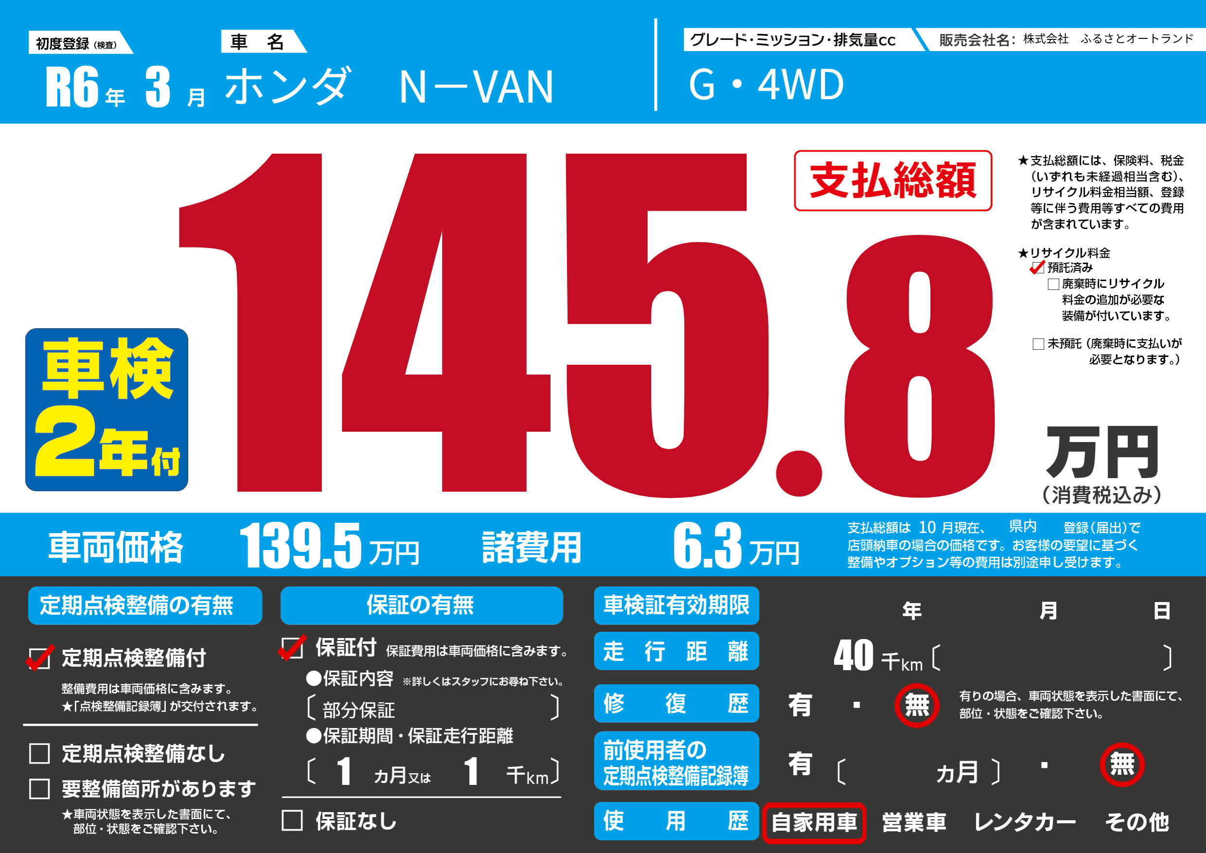 | 走行キロ | 4万km | 初年度登録 | R6年3月 |