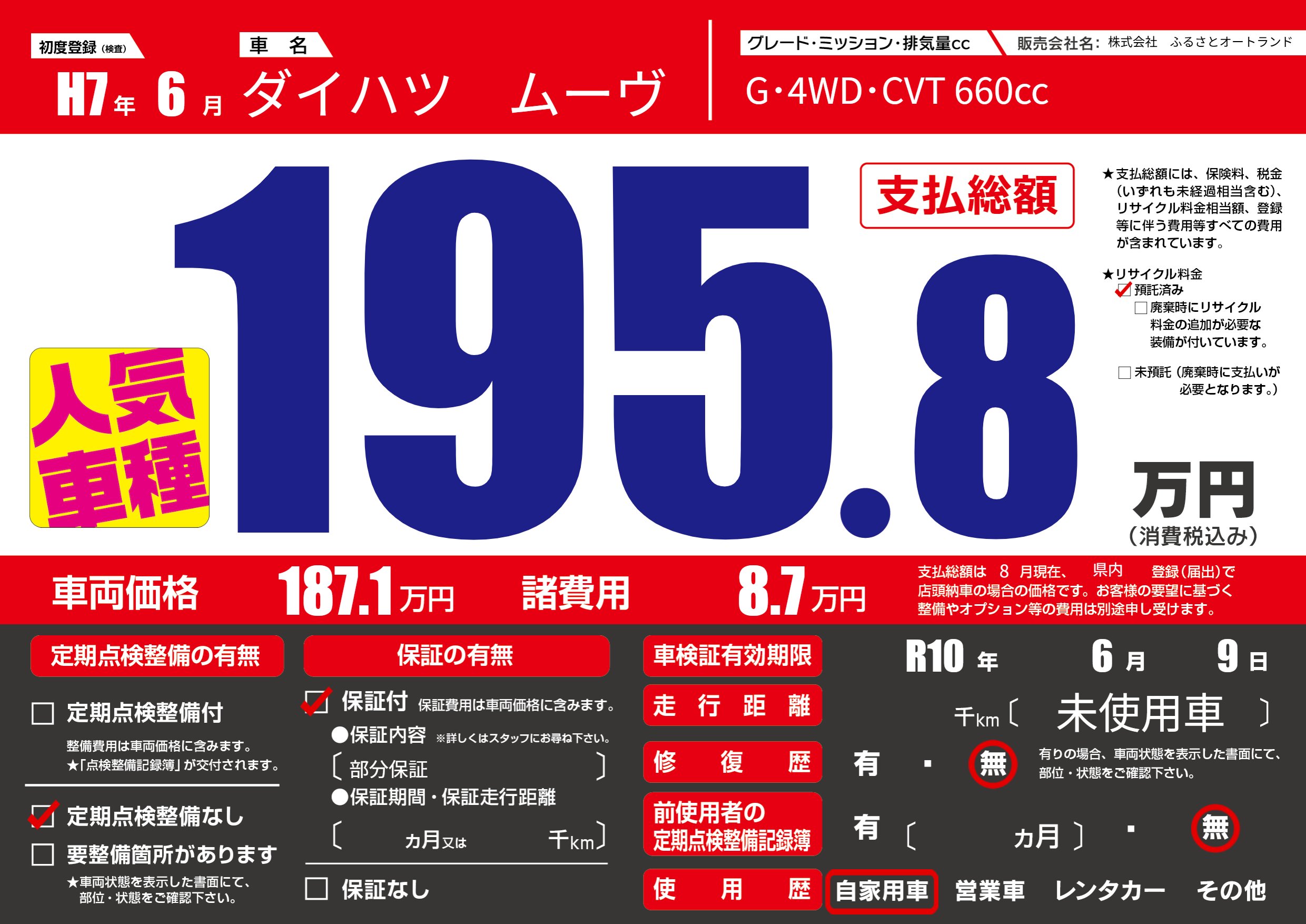| 走行キロ | - | 初年度登録 | H7年6月 |