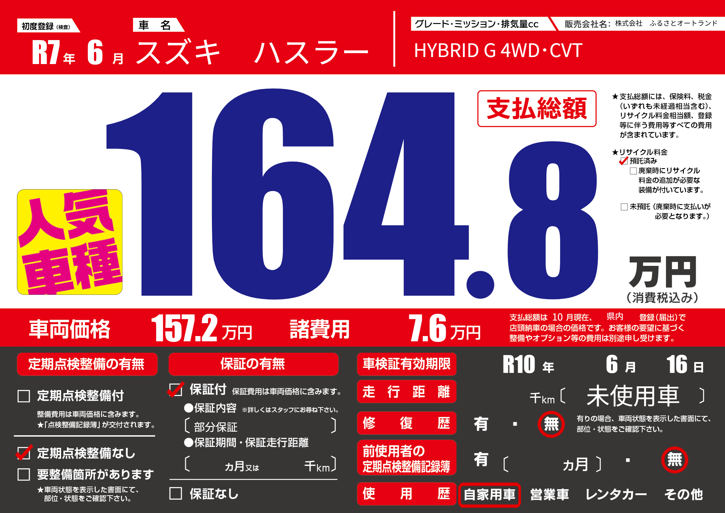 | 走行キロ | - | 初年度登録 | R7年6月 |