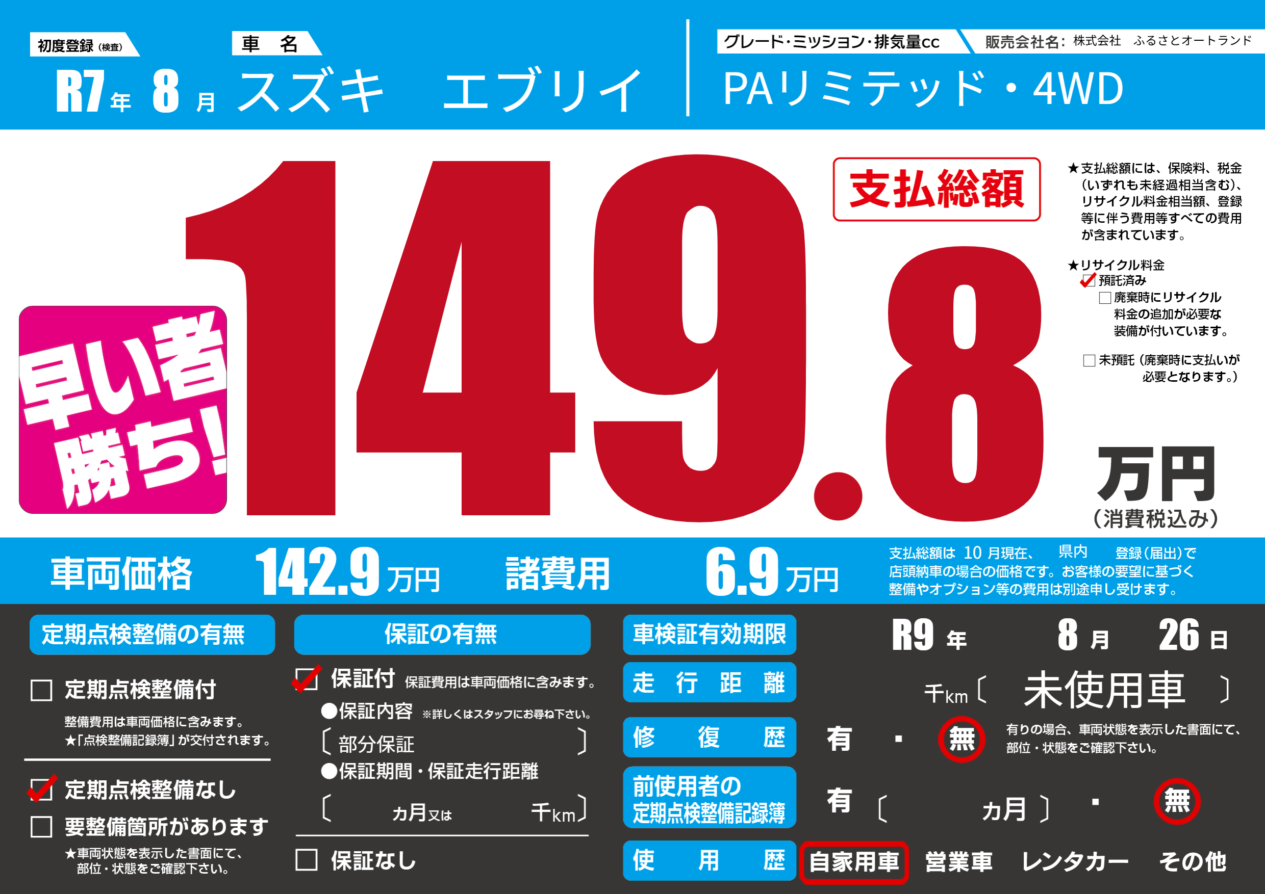 | 走行キロ | - | 初年度登録 | R7年8月 |