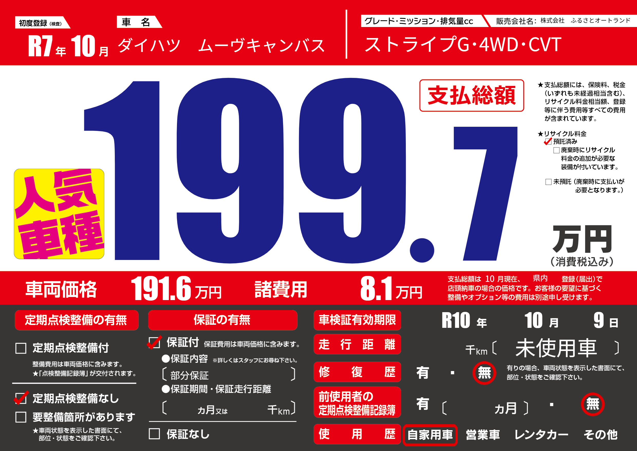 | 走行キロ | - | 初年度登録 | R7年10月 |