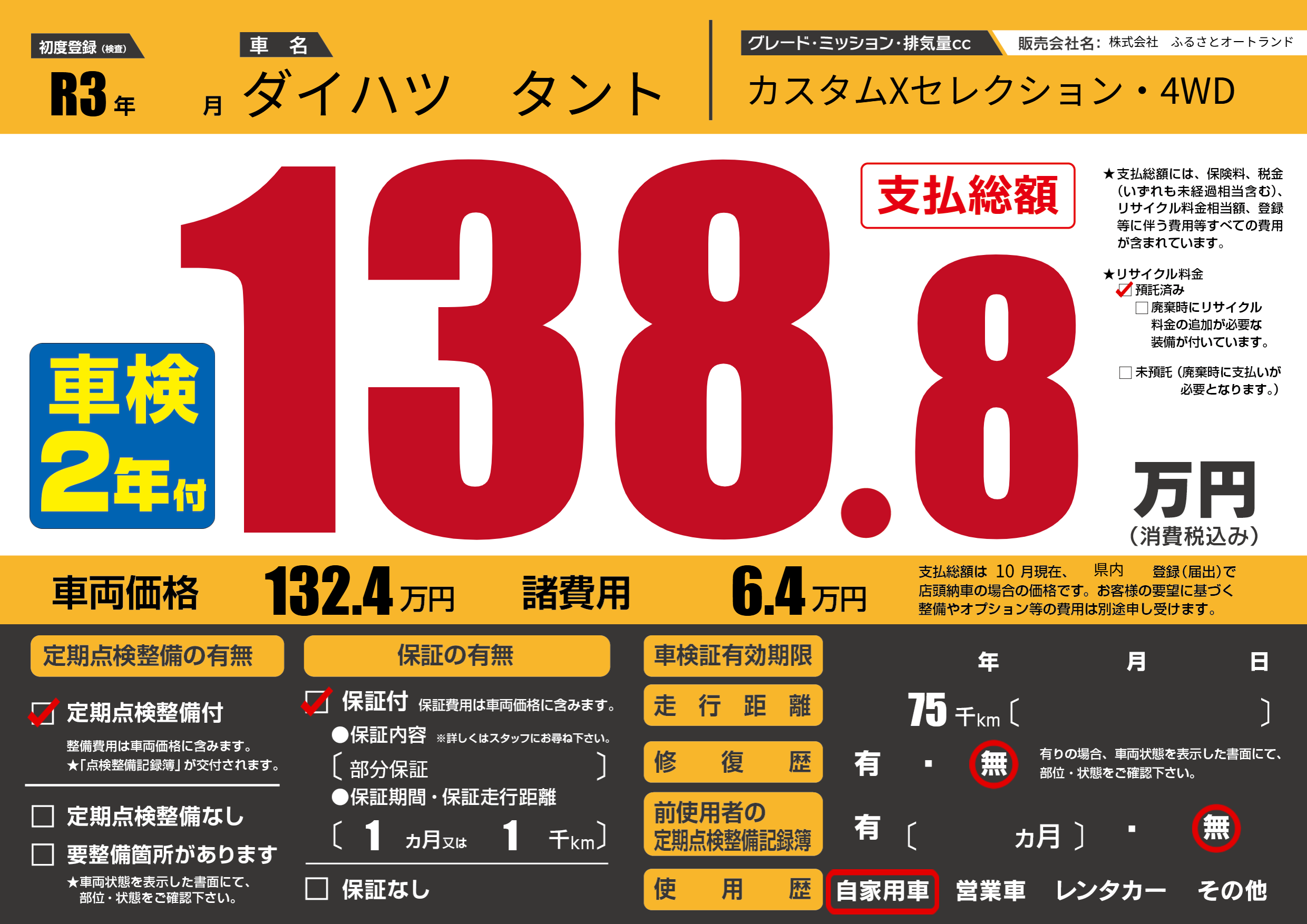 | 車名 | ダイハツ タント | グレード ミッション 排気量 |