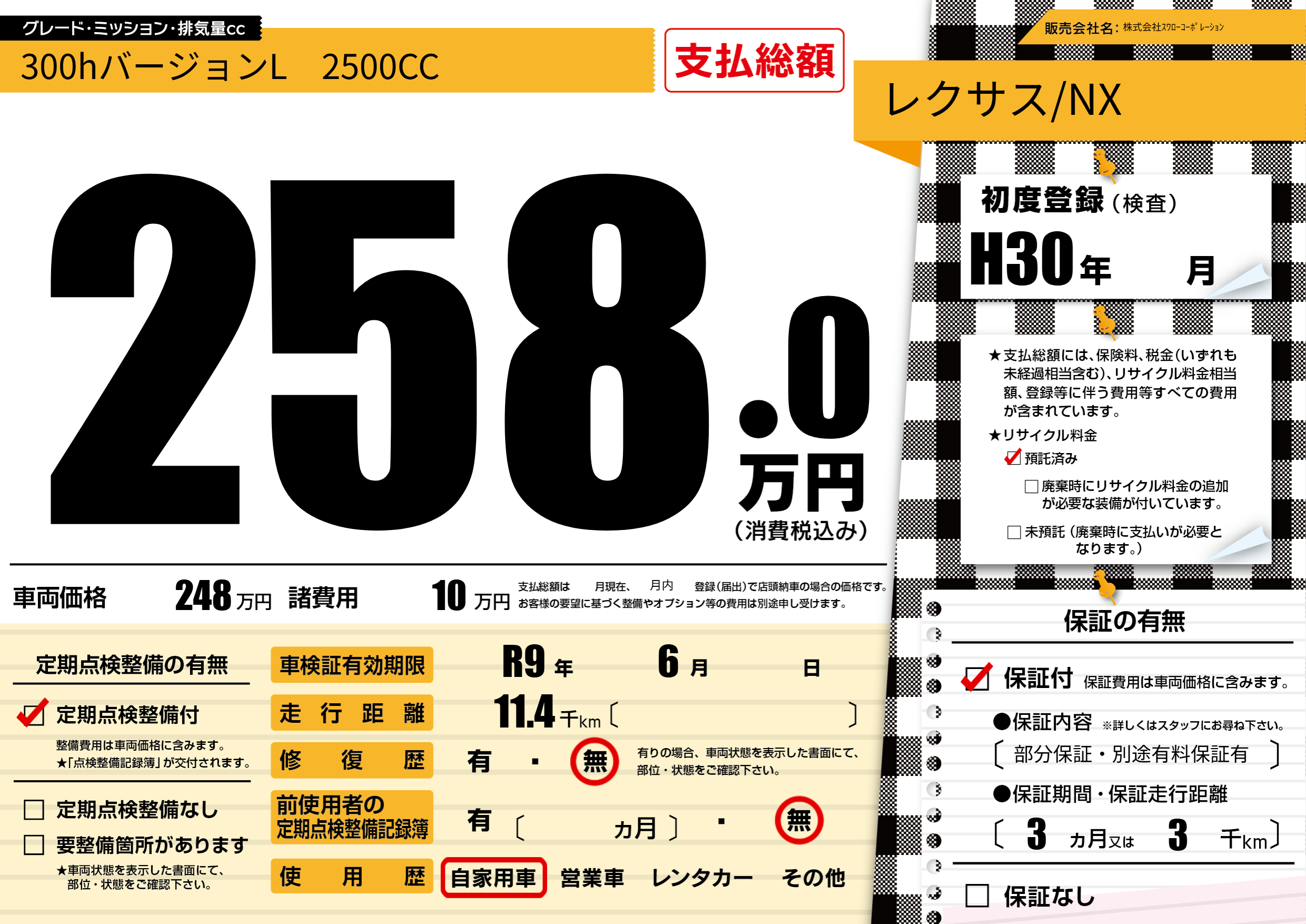 | 車名 | レクサス/NX | グレード ミッション 排気量 |