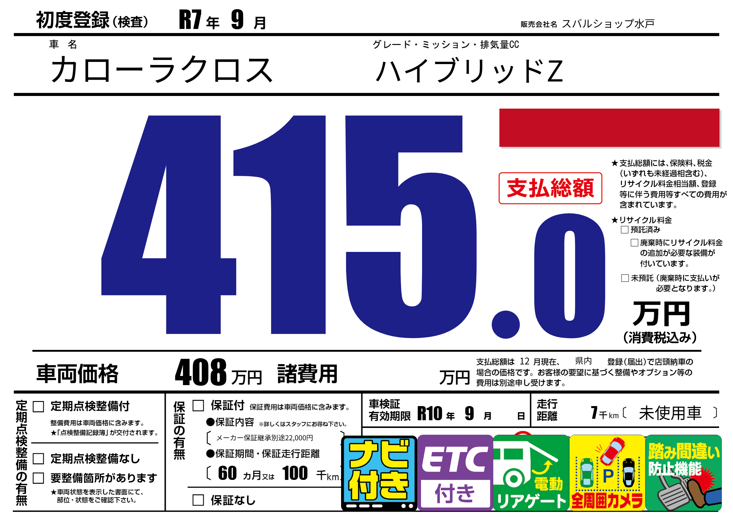| 車検制限 | R10年 9月 - 日 | ||