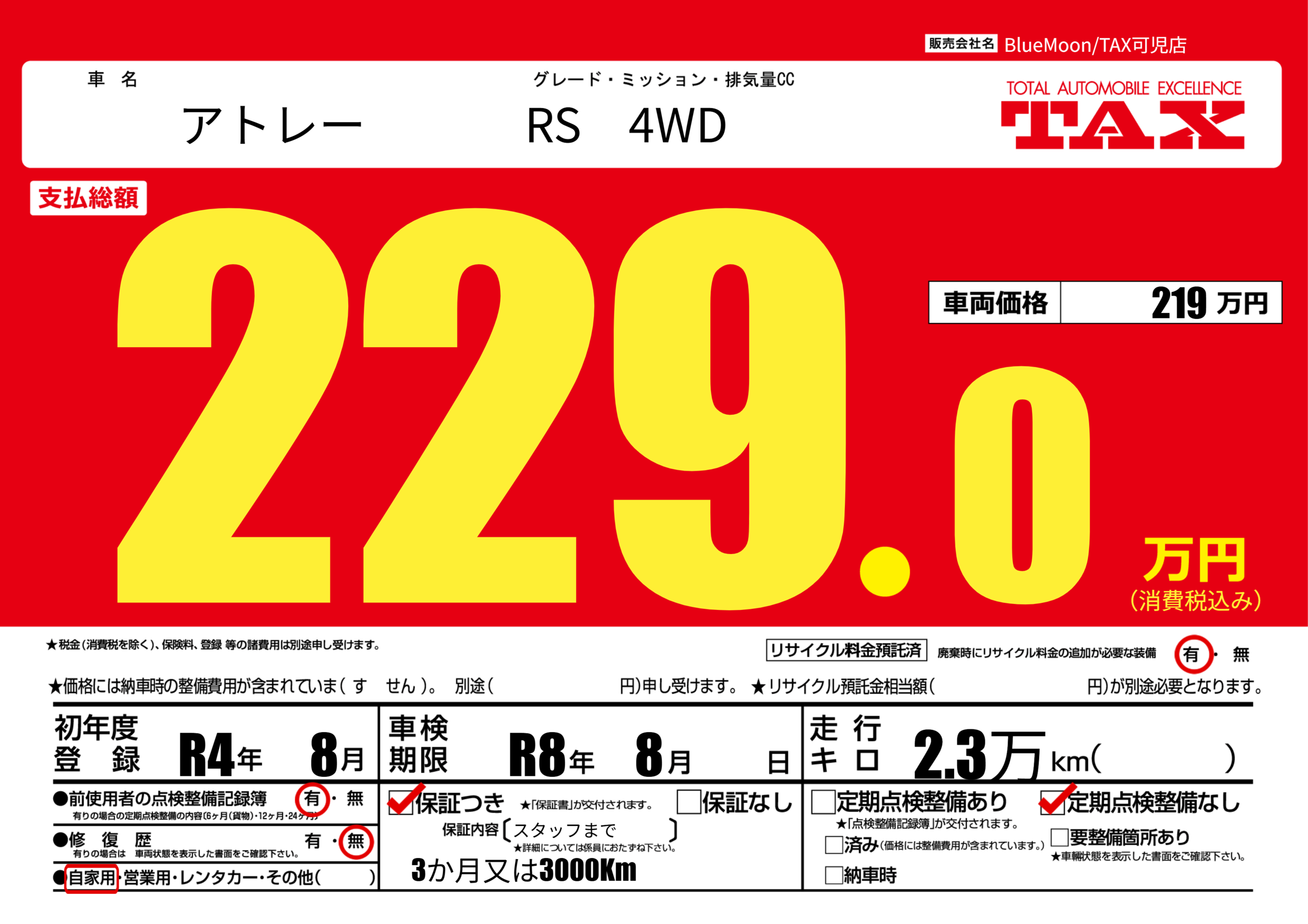 | 走行キロ | 0.2万km | 初年度登録 | R4年8月 |