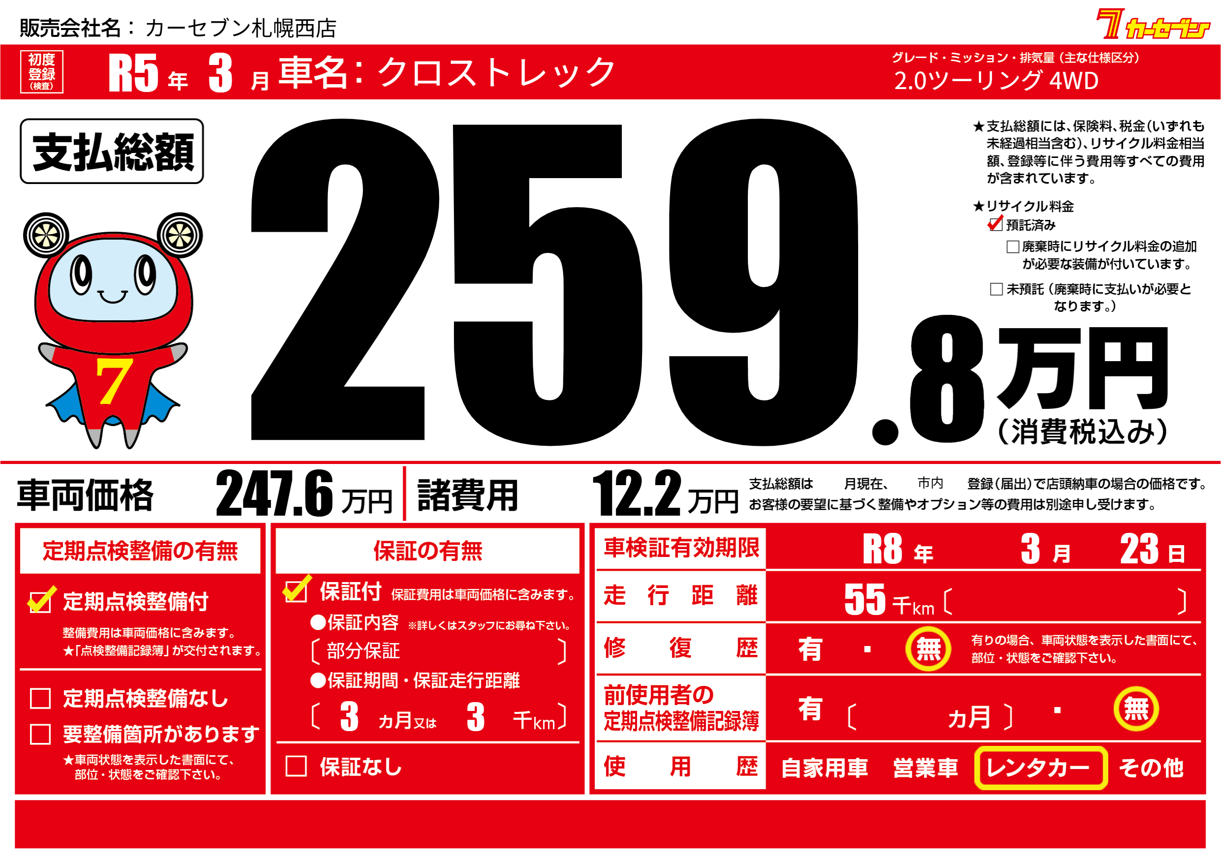 | 走行キロ | 5.5万km | 初年度登録 | R5年3月 |