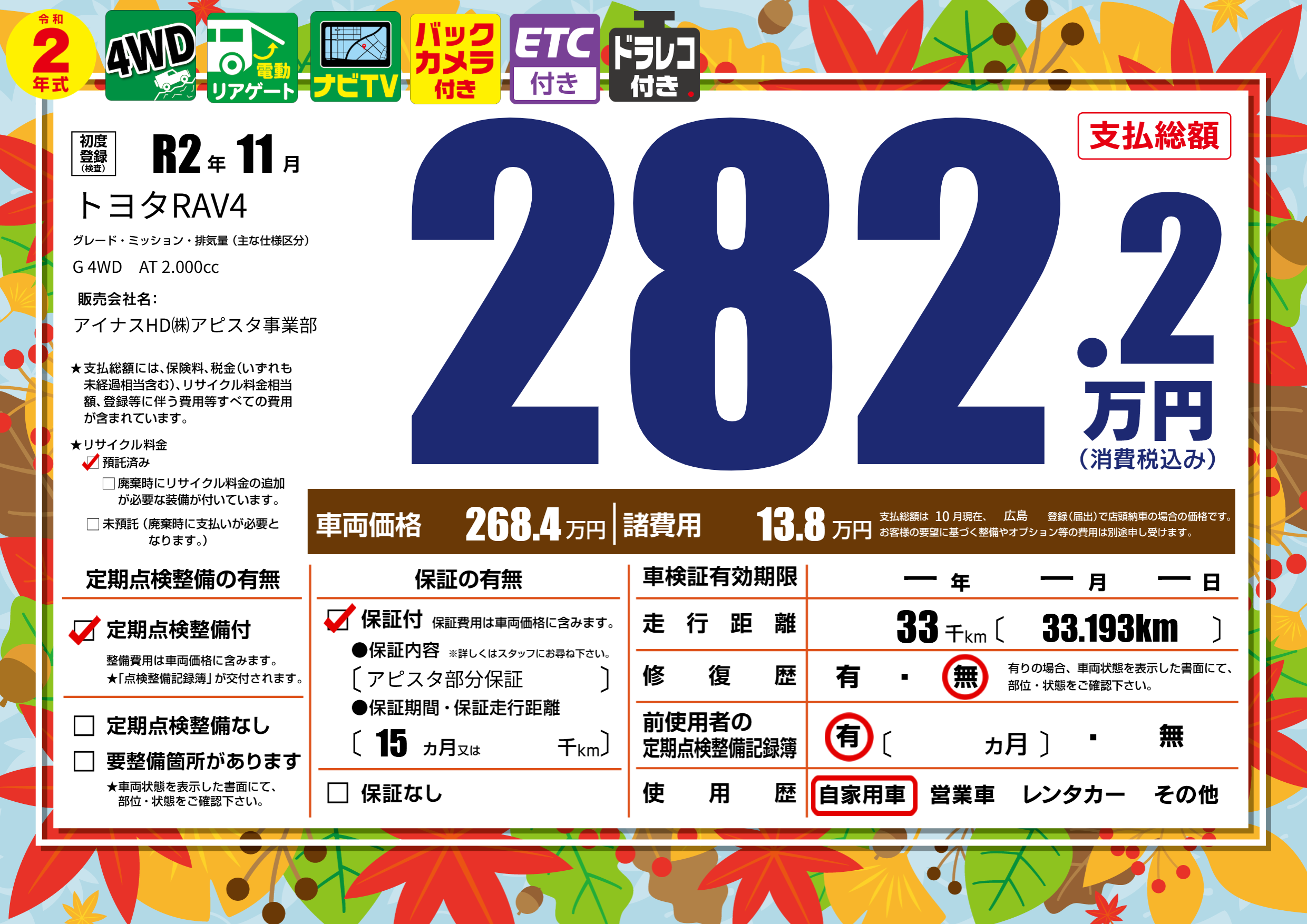 | 走行キロ | 3.3万km | 初年度登録 | R2年11月 |