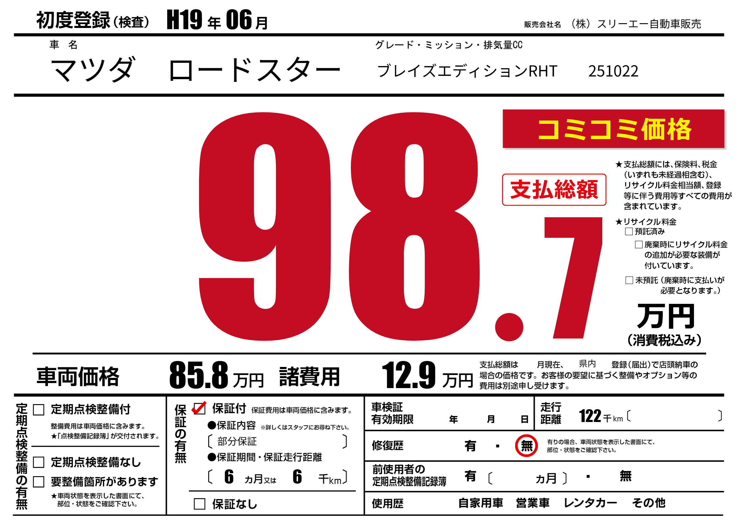| 車名 | マツダ ロードスター | グレード ミッション 排気量 |