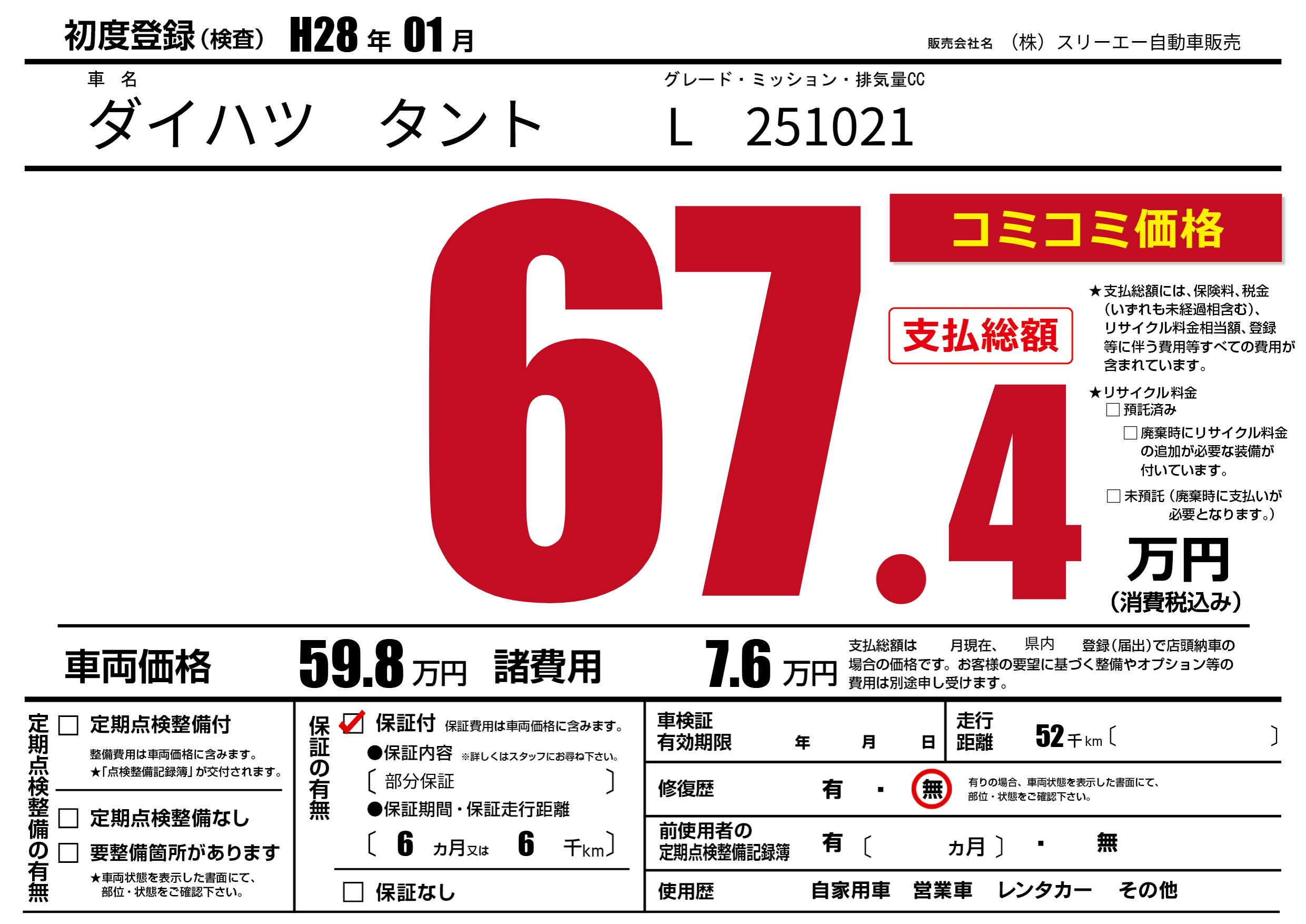 | 車名 | ダイハツ タント | グレード ミッション 排気量 |