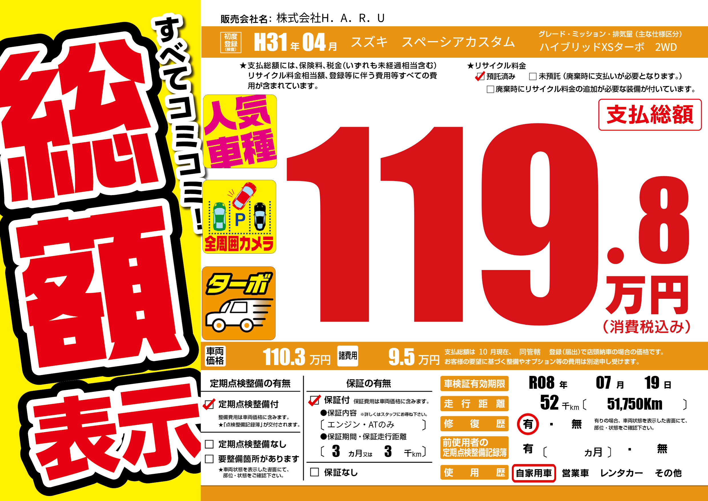 | 車名 | スズキ スペーシアカスタム | グレード ミッション 排気量 |