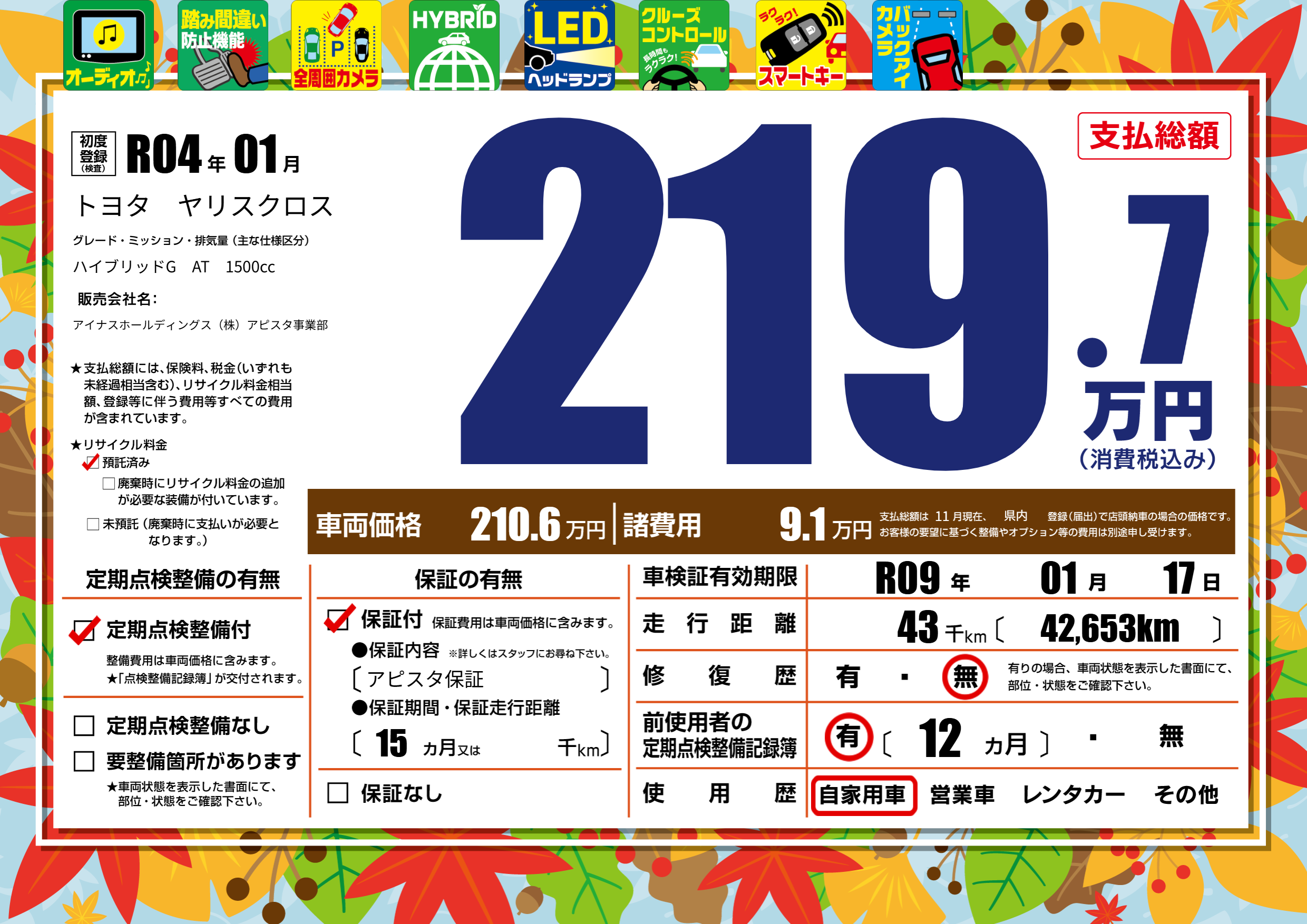 保証付き 保証内容(アピスタ保証) 15ヶ月または千km |