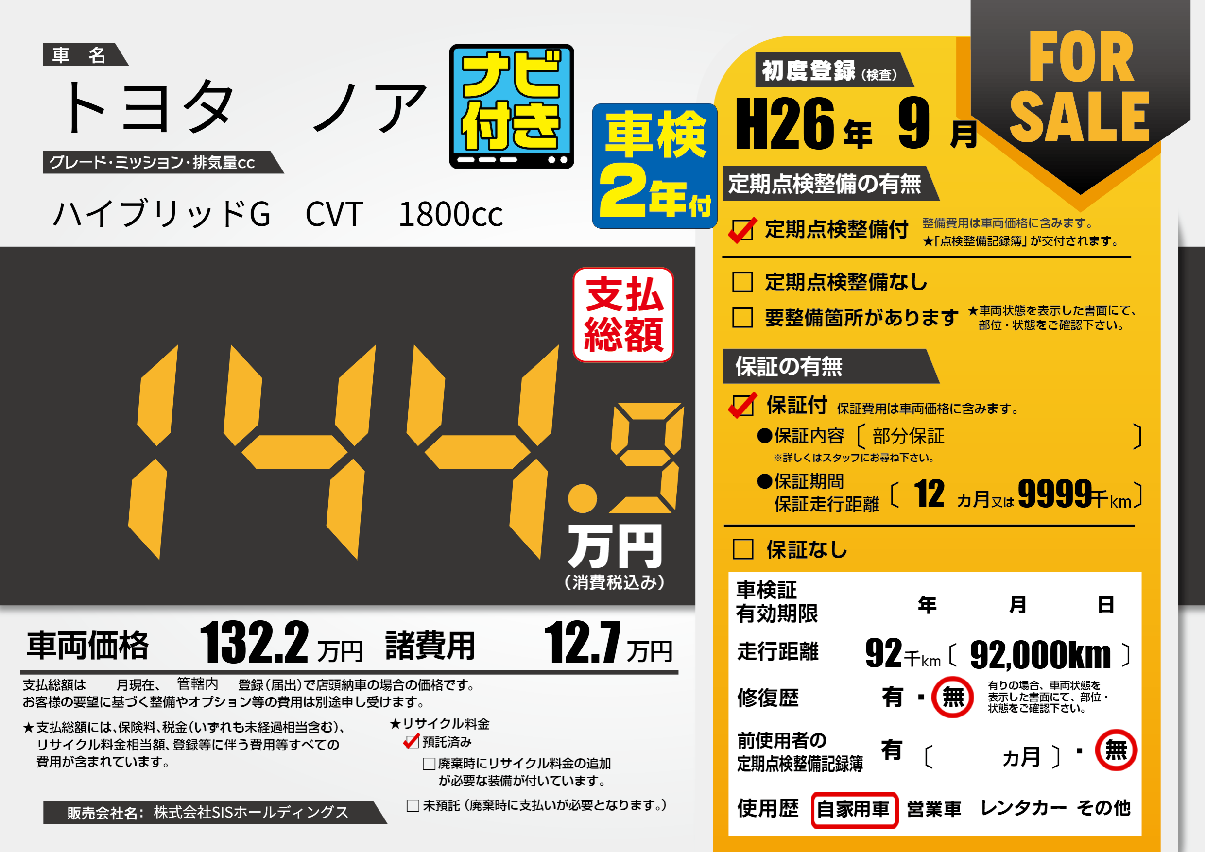 | 走行キロ | 9.2万km | 初年度登録 | H26年9月 |