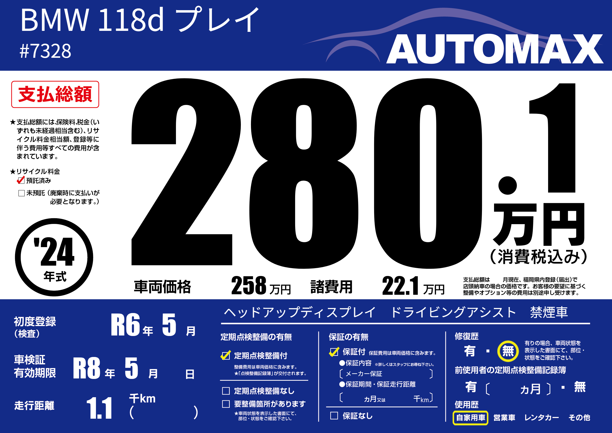 | 車名 | BMW 118d プレイ | グレード ミッション 排気量 |