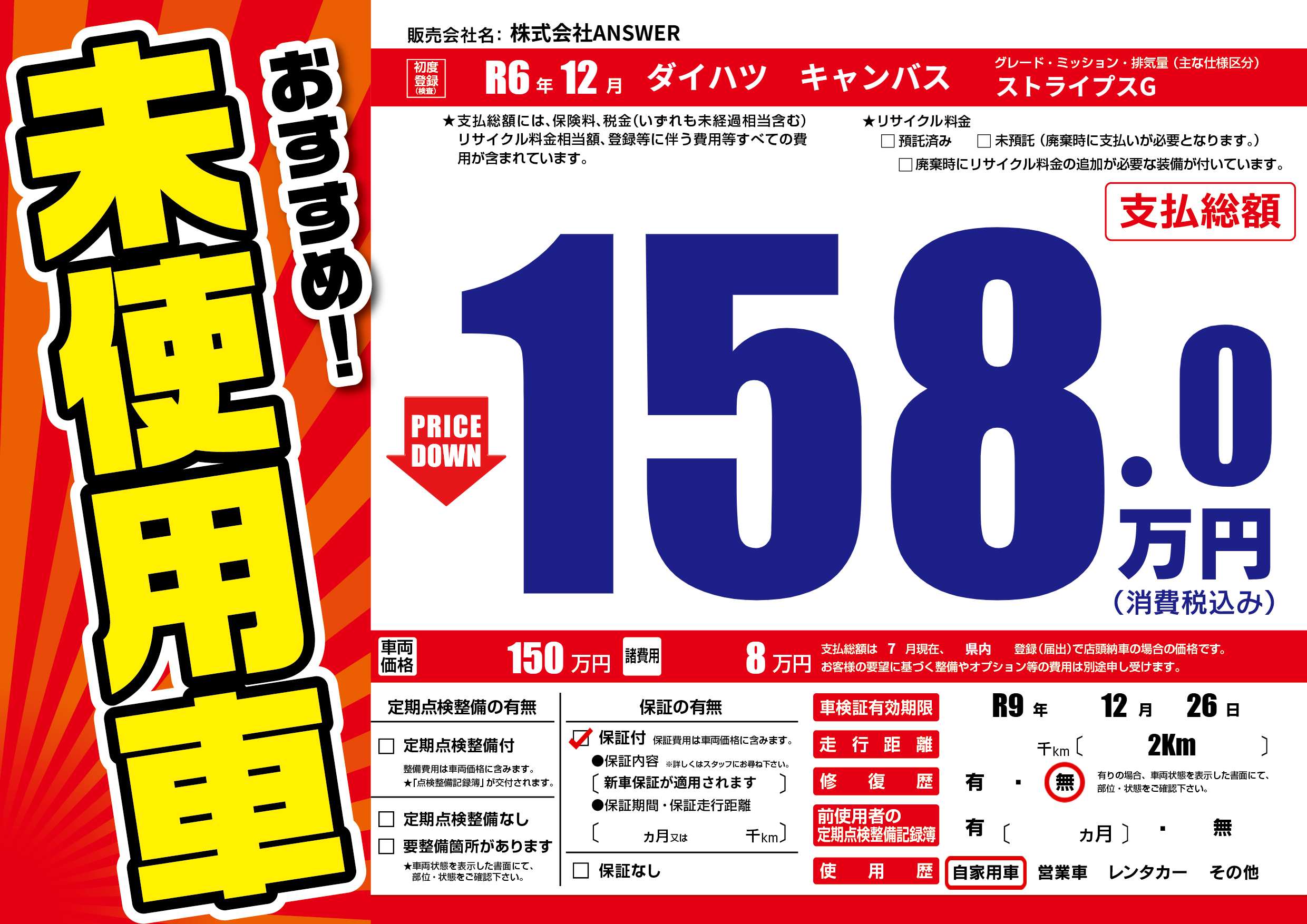 | 走行キロ | - | 初年度登録 | R6年12月 |