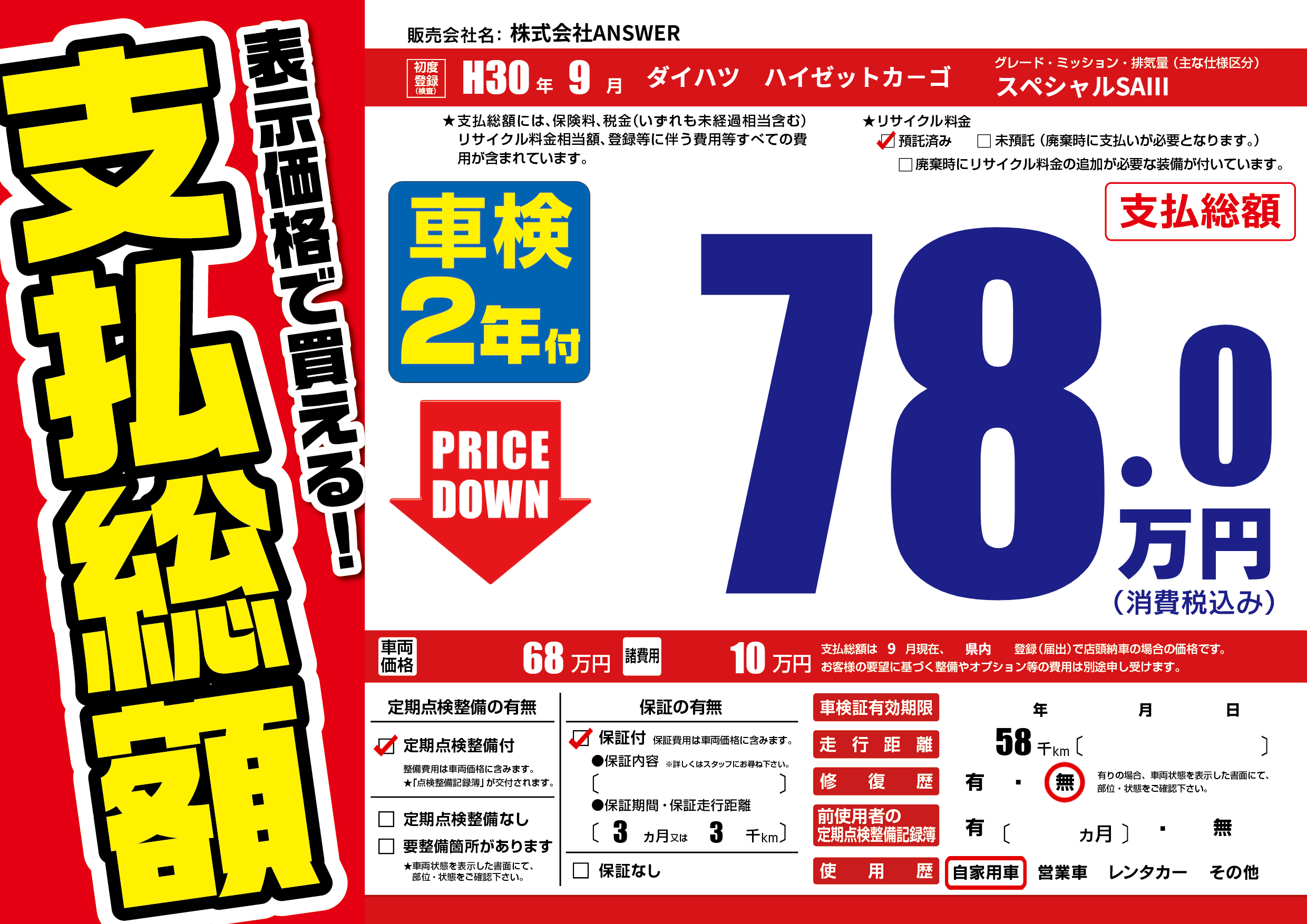 | 走行キロ | 5.8万km | 初年度登録 | H30年9月 |