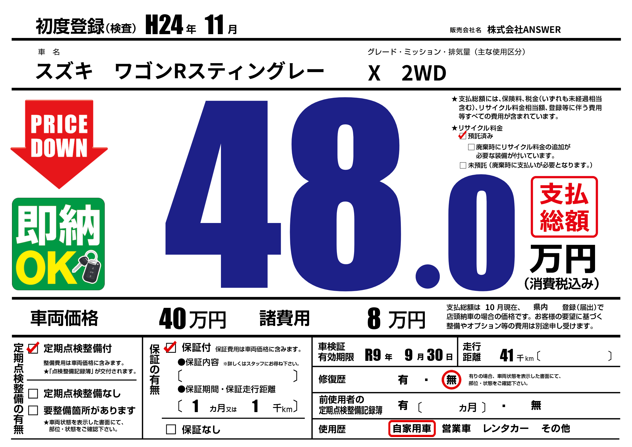 | 走行キロ | 4.1万km | 初年度登録 | H24年11月 |