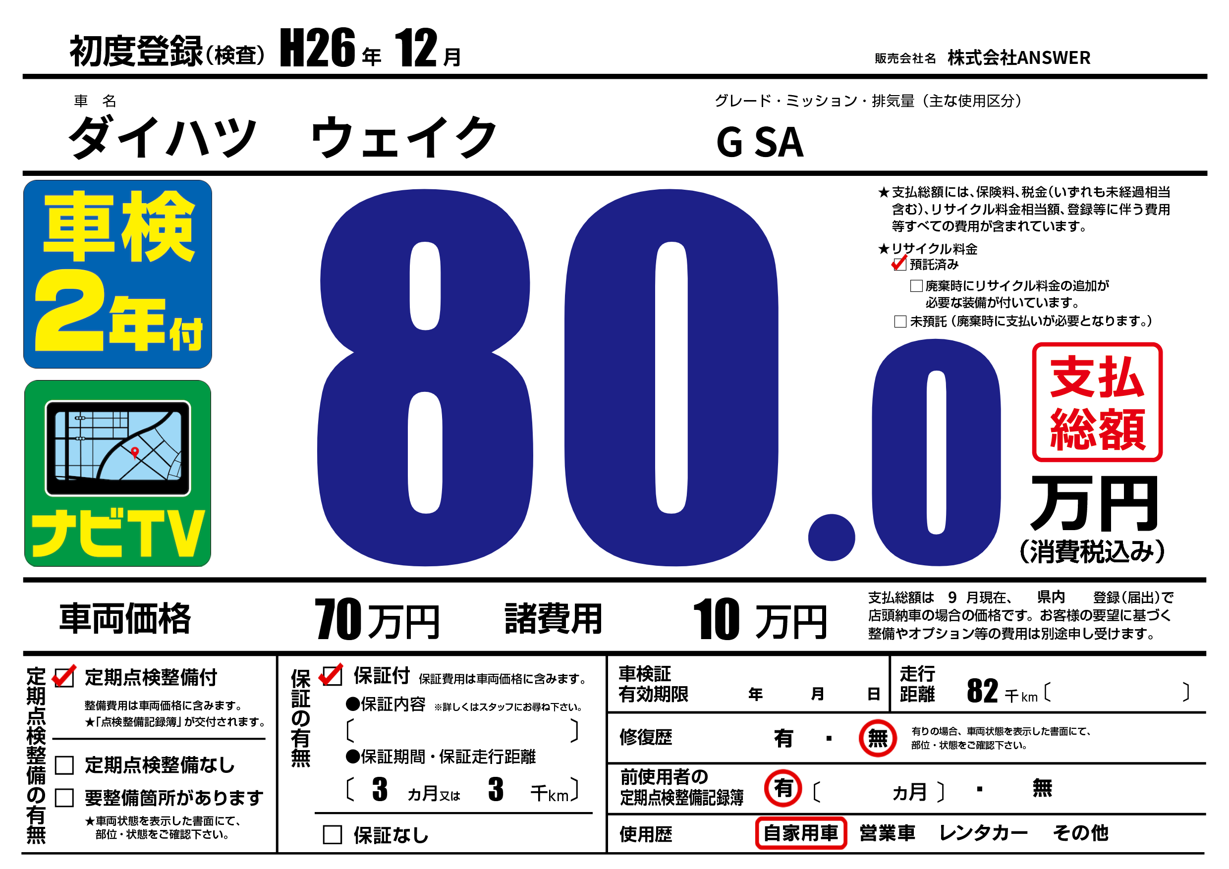 | 車名 | ダイハツ ウェイク | グレード ミッション 排気量 |