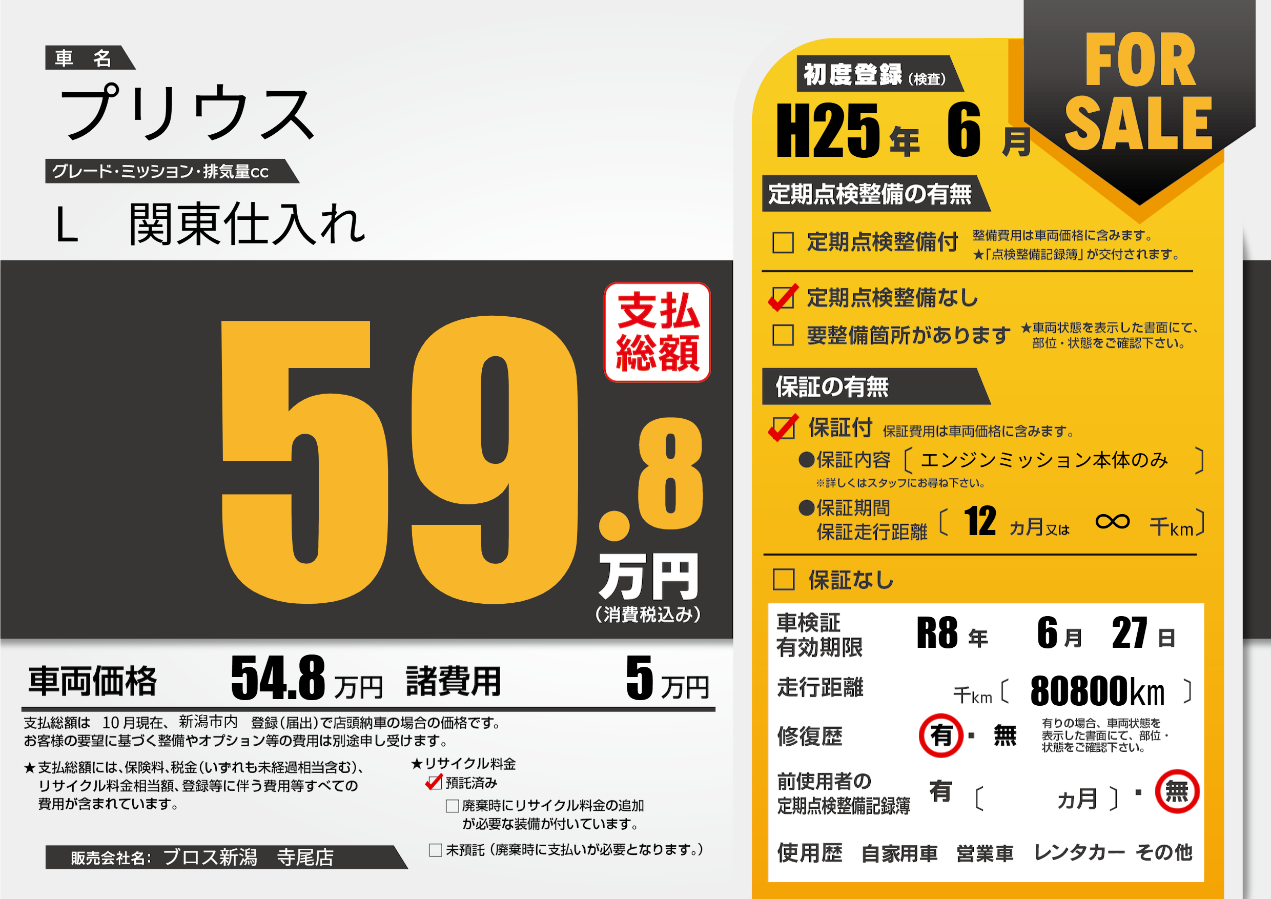 | 車名 | プリウス | グレード ミッション 排気量 |