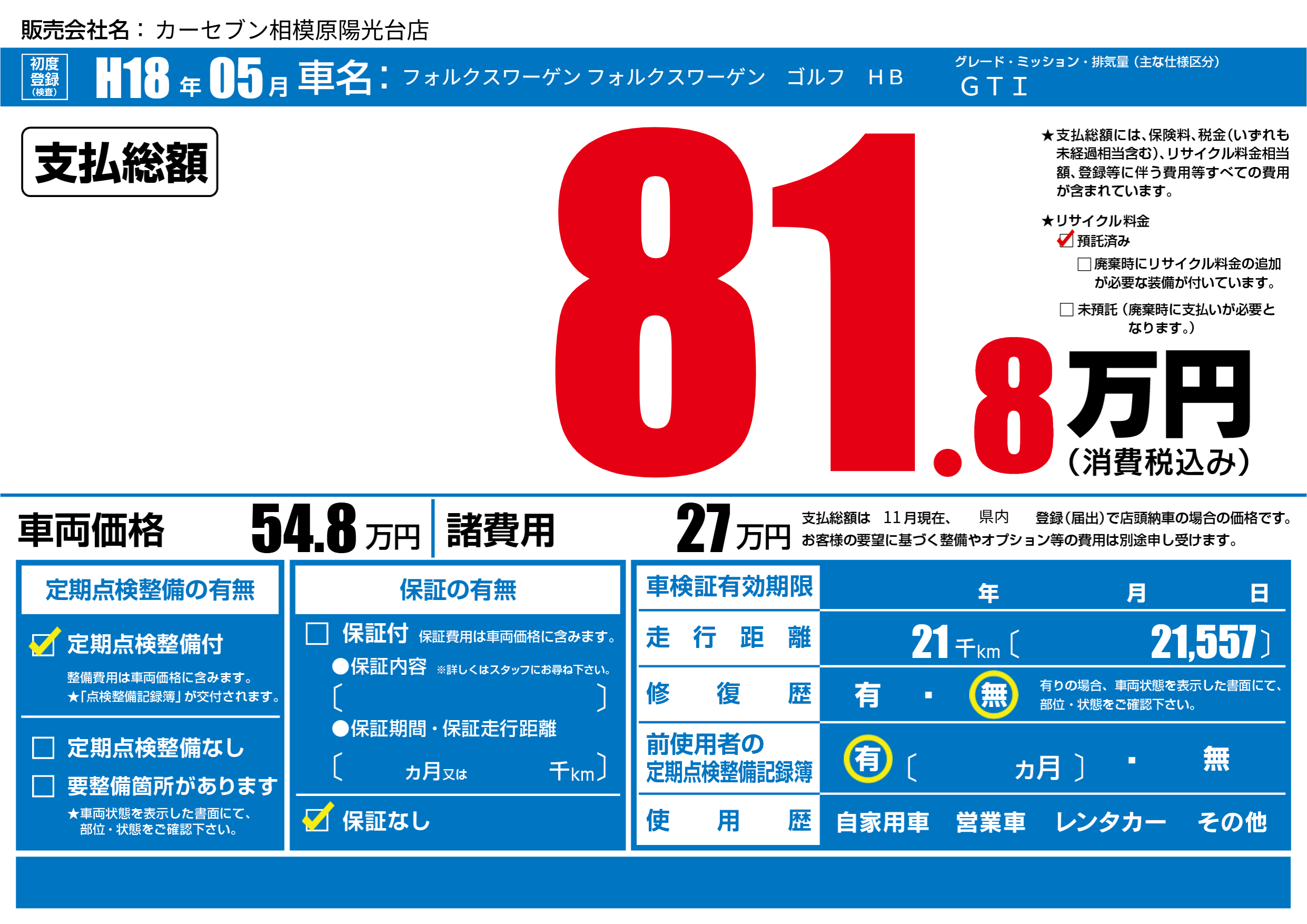 | 車名 | フォルクスワーゲン フォルクスワーゲン ゴルフ HB | グレード ミッション 排気量 |