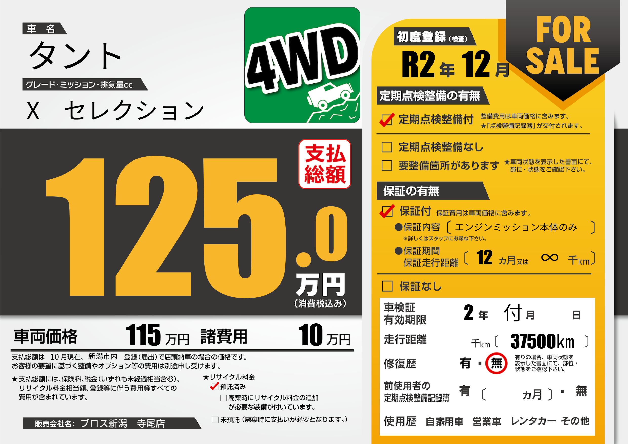 | 走行キロ | - | 初年度登録 | R2年12月 |