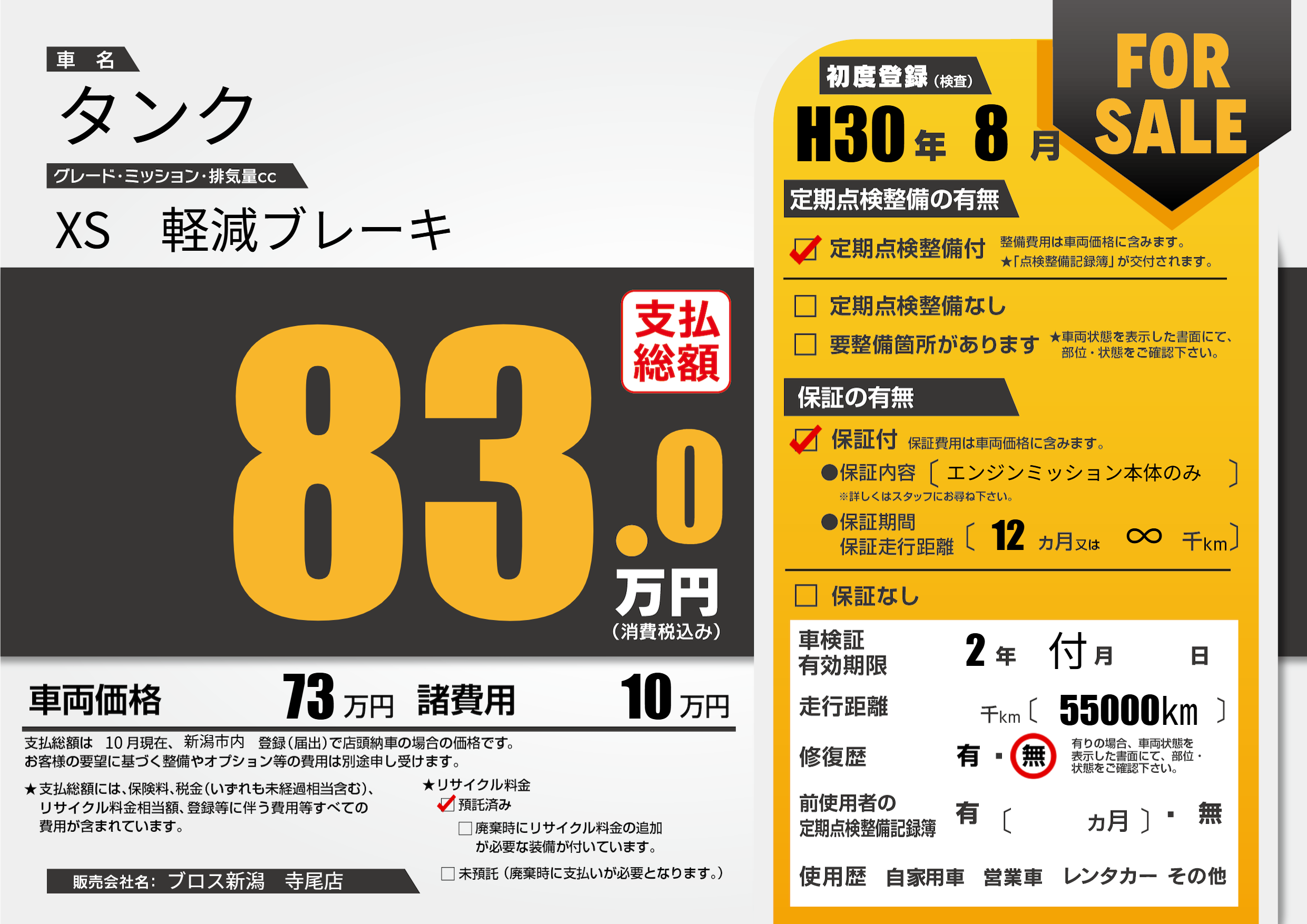 | 走行キロ | - | 初年度登録 | H30年8月 |