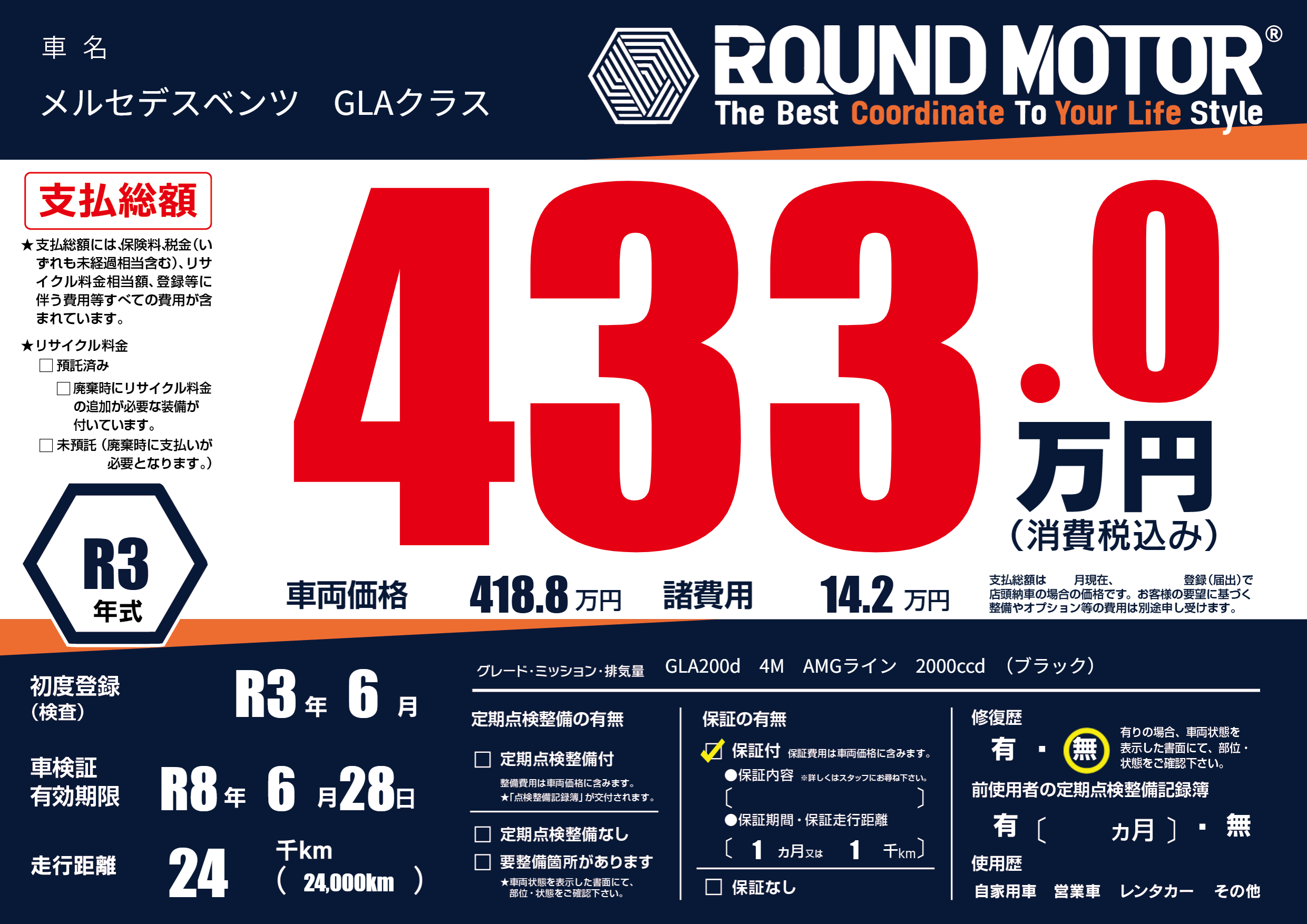 | 車名 | メルセデスベンツ GLAクラス | グレード ミッション 排気量 |