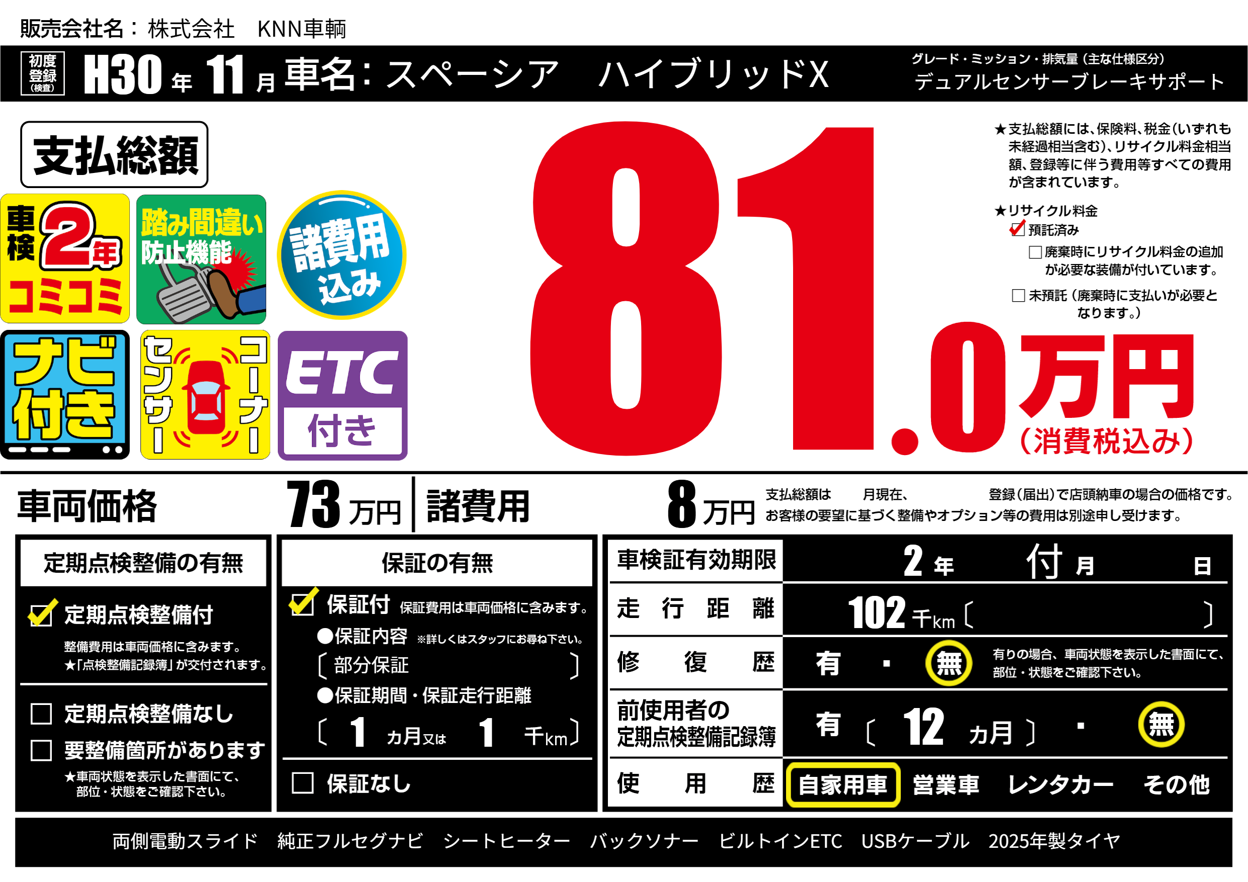 | 走行キロ | 10.2万km | 初年度登録 | H30年11月 |