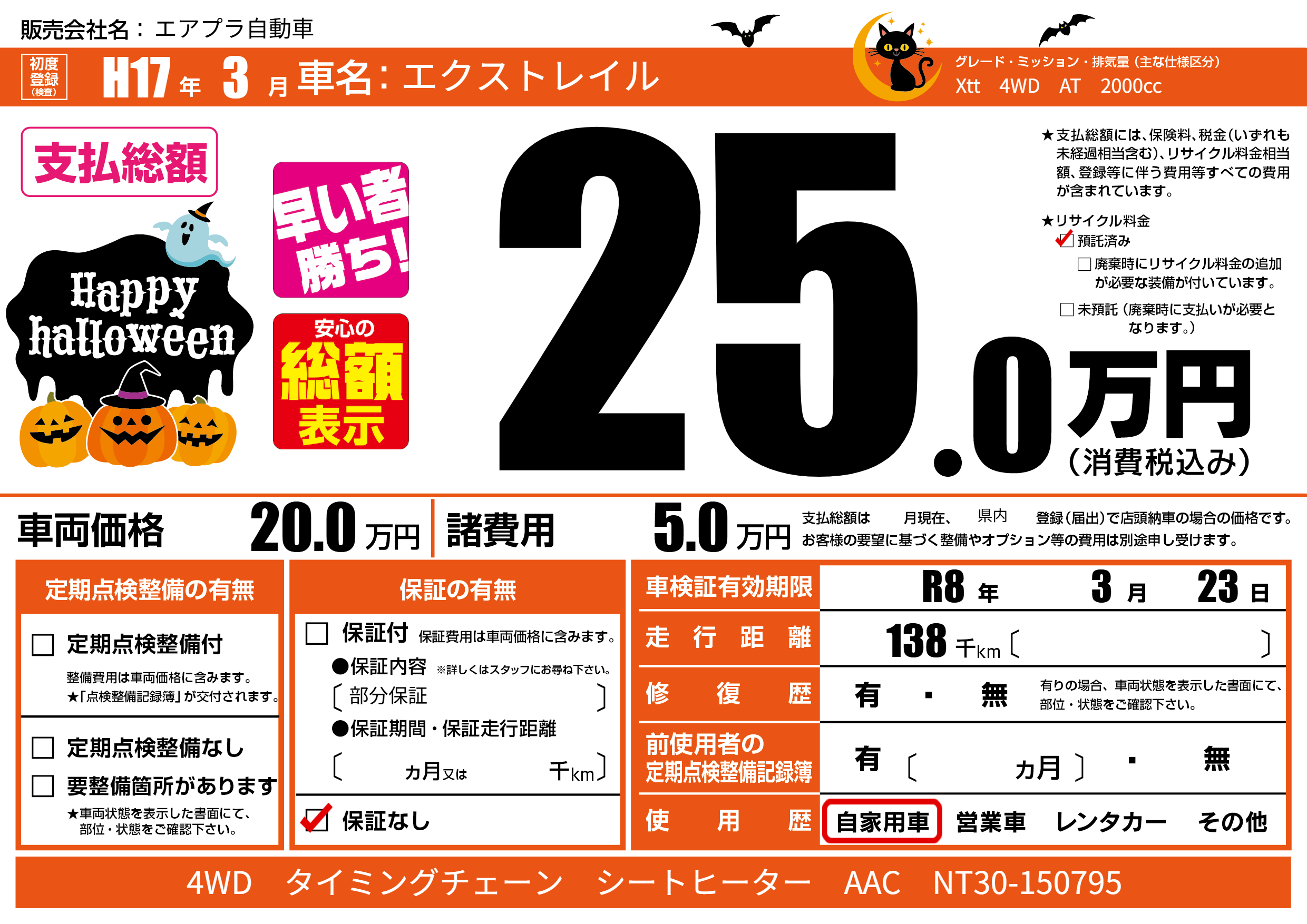| 走行キロ | 13.8万km | 初年度登録 | H17年3月 |