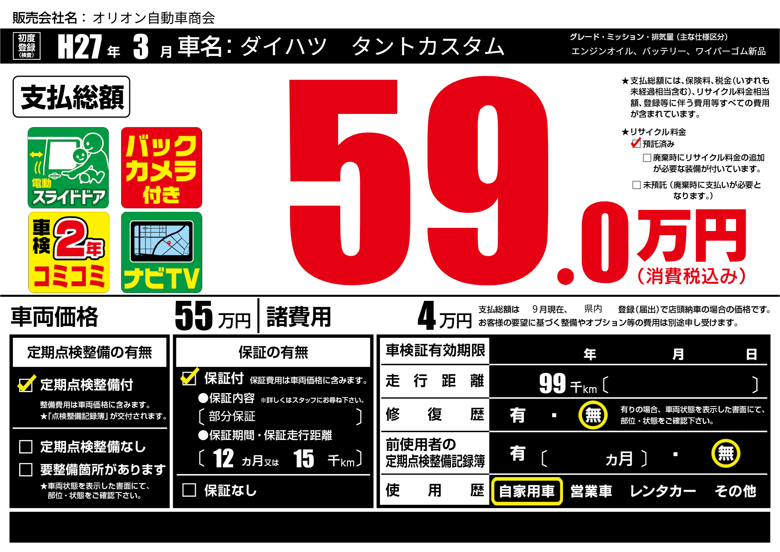 | 車名 | ダイハツ タントカスタム | グレード ミッション 排気量 |