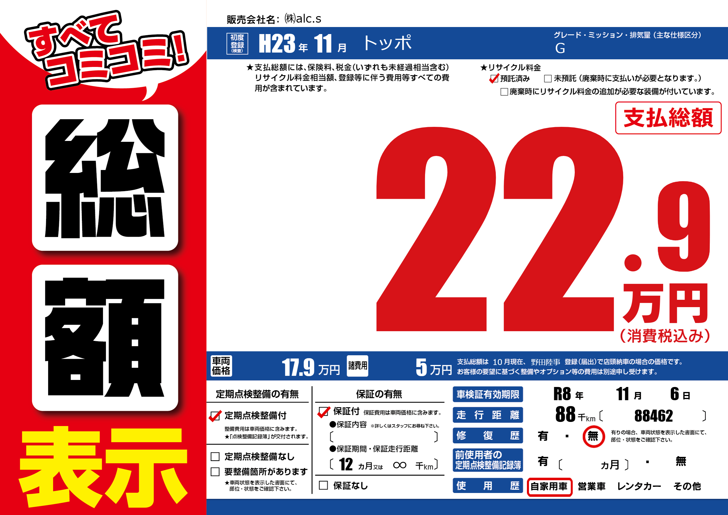 | 走行キロ | 8.8万km | 初年度登録 | H23年11月 |