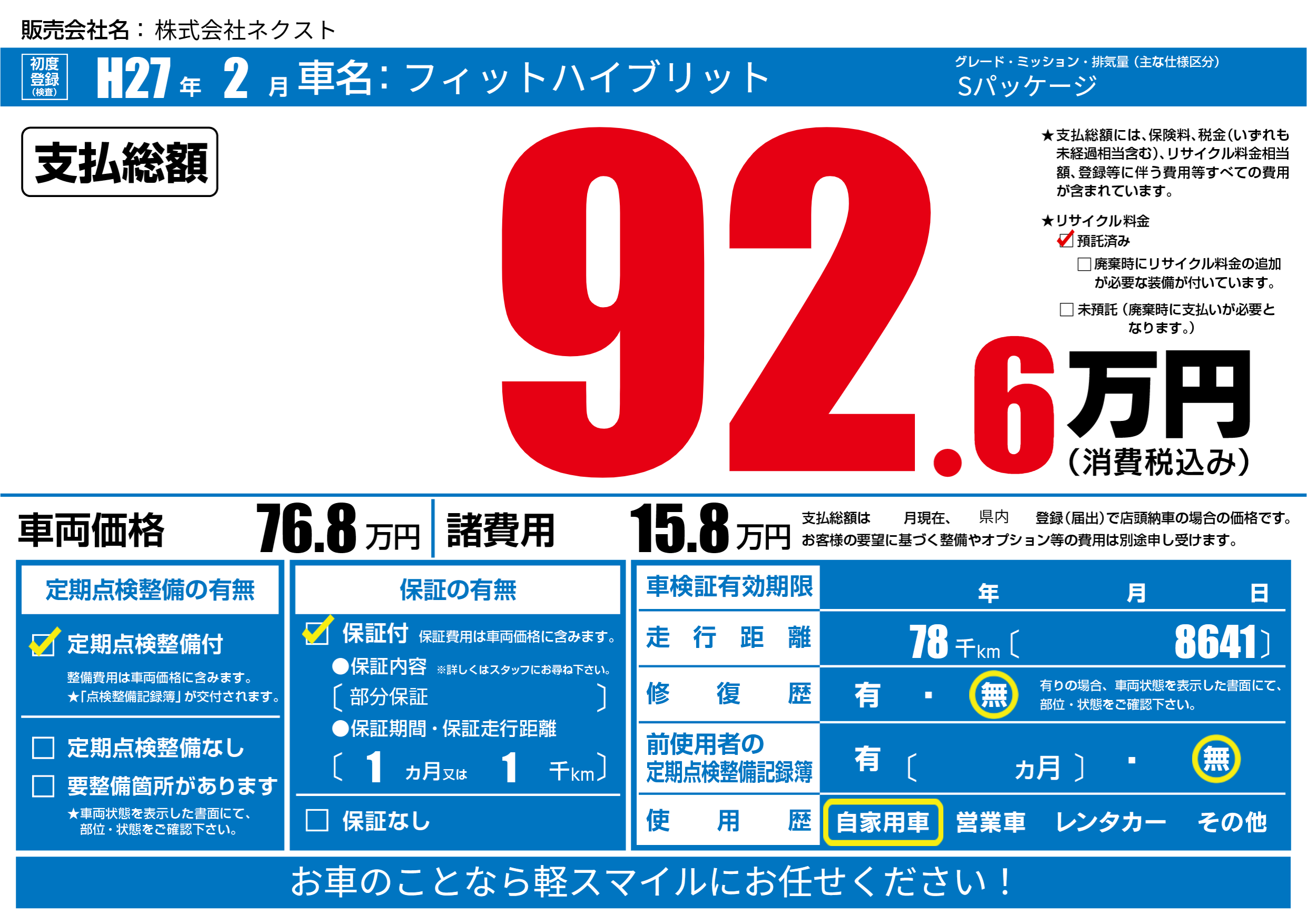 | 走行キロ | 7.8万km | 初年度登録 | H27年2月 |