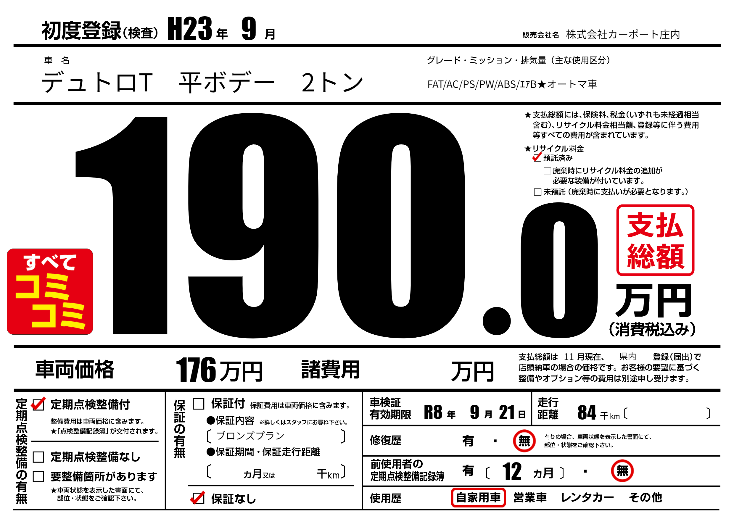| 走行キロ | 8.4万km | 初年度登録 | H23年9月 |