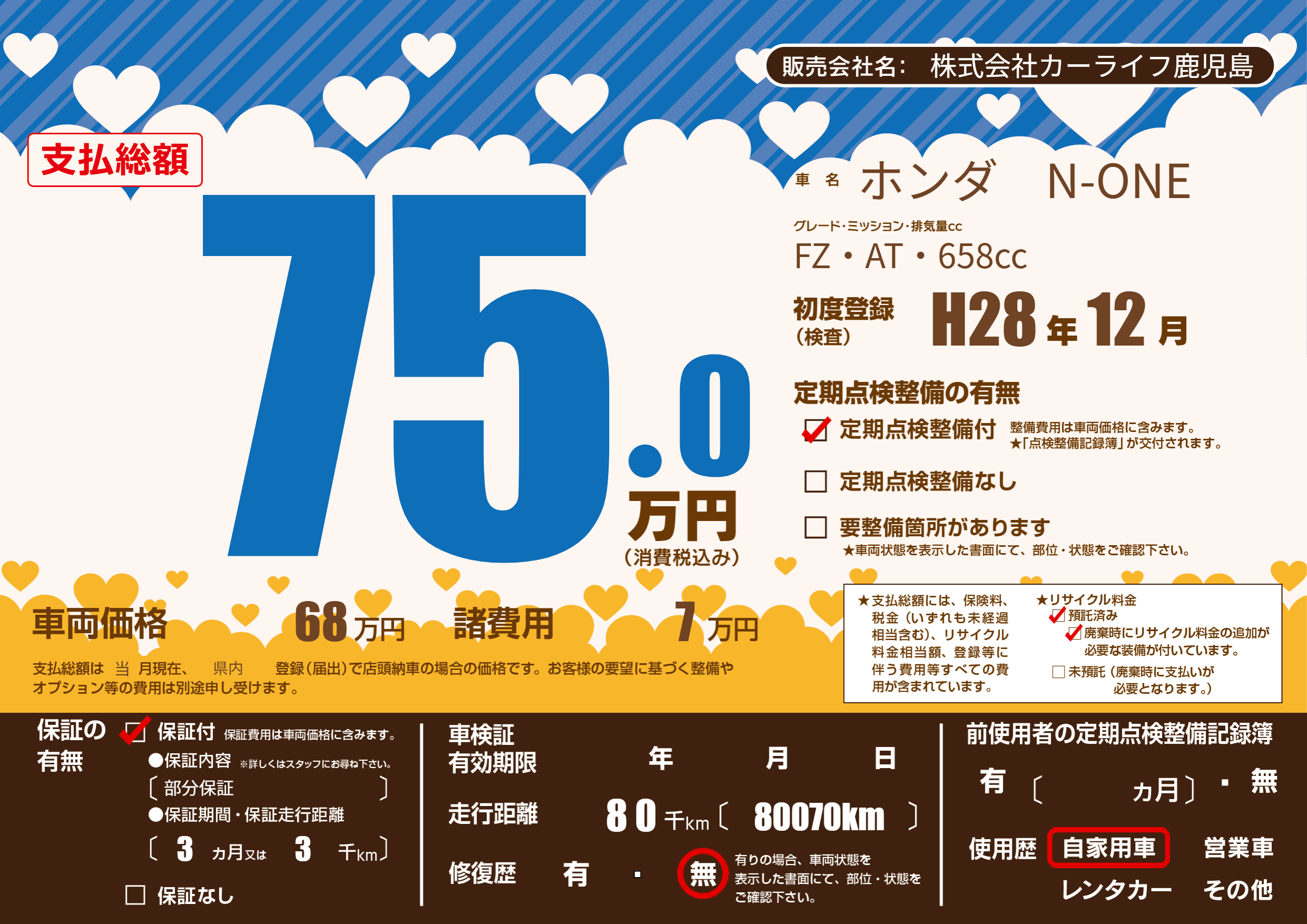 | 車名 | ホンダ N-ONE | グレード ミッション 排気量 |