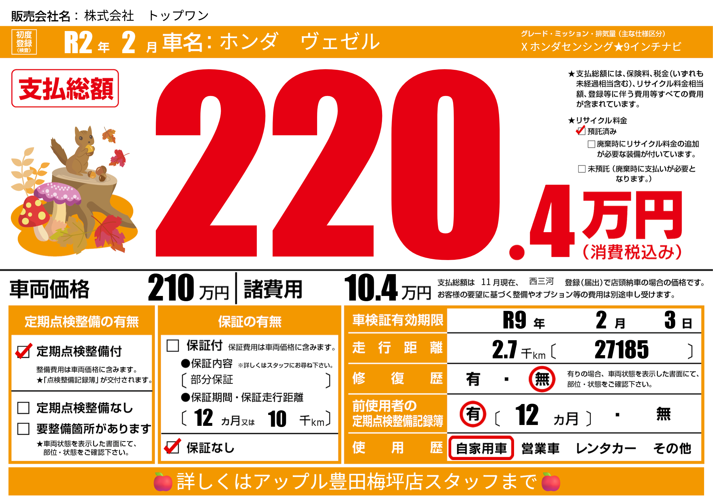 | 走行キロ | 0.2万km | 初年度登録 | R2年2月 |