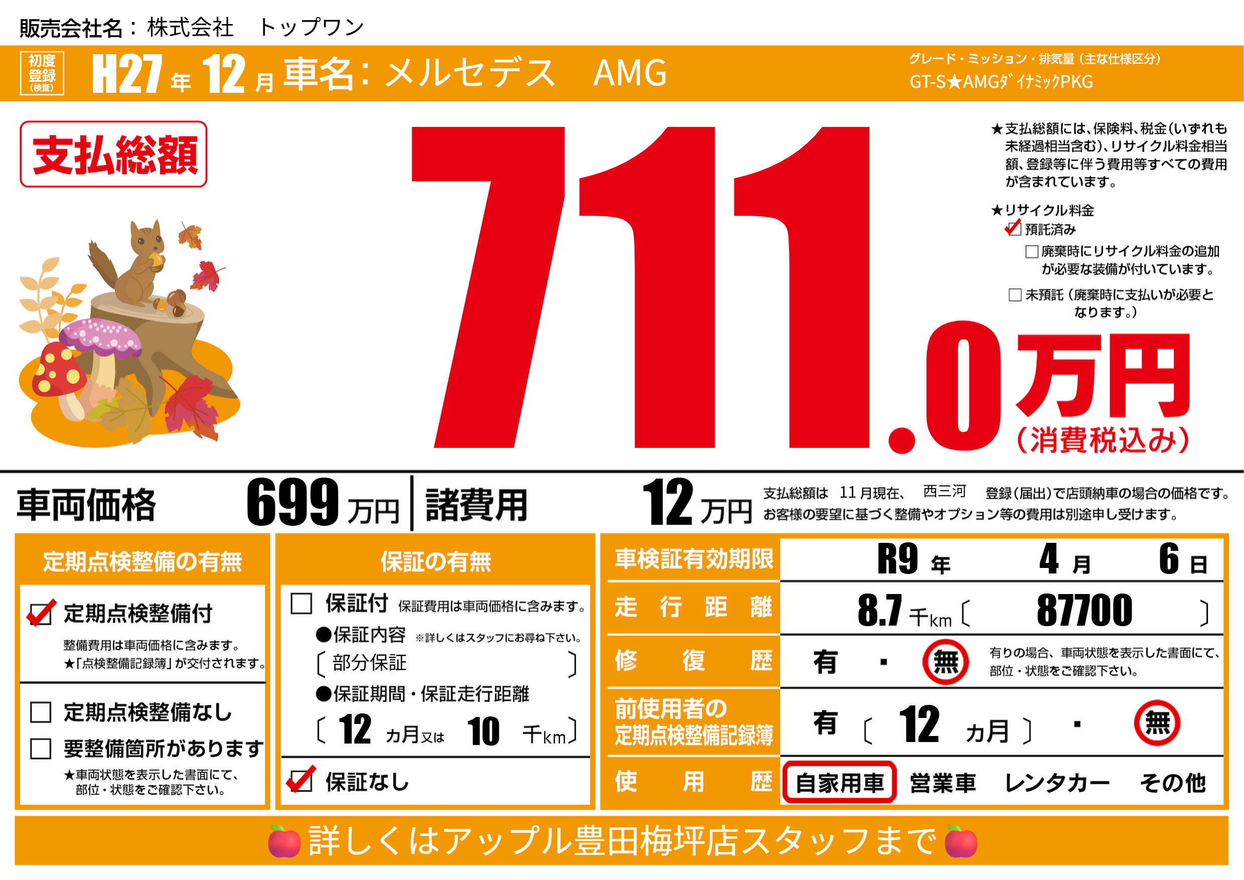 | 車名 | メルセデス AMG | グレード ミッション 排気量 |