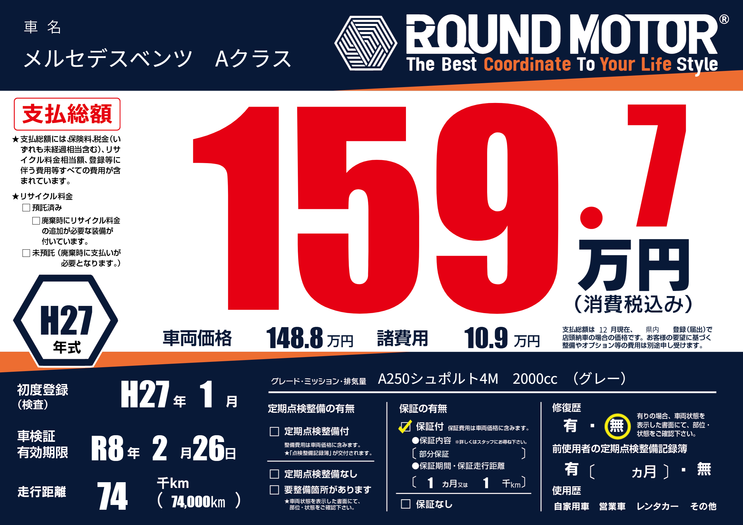 | 車名 | メルセデスベンツ Aクラス | グレード ミッション 排気量 |