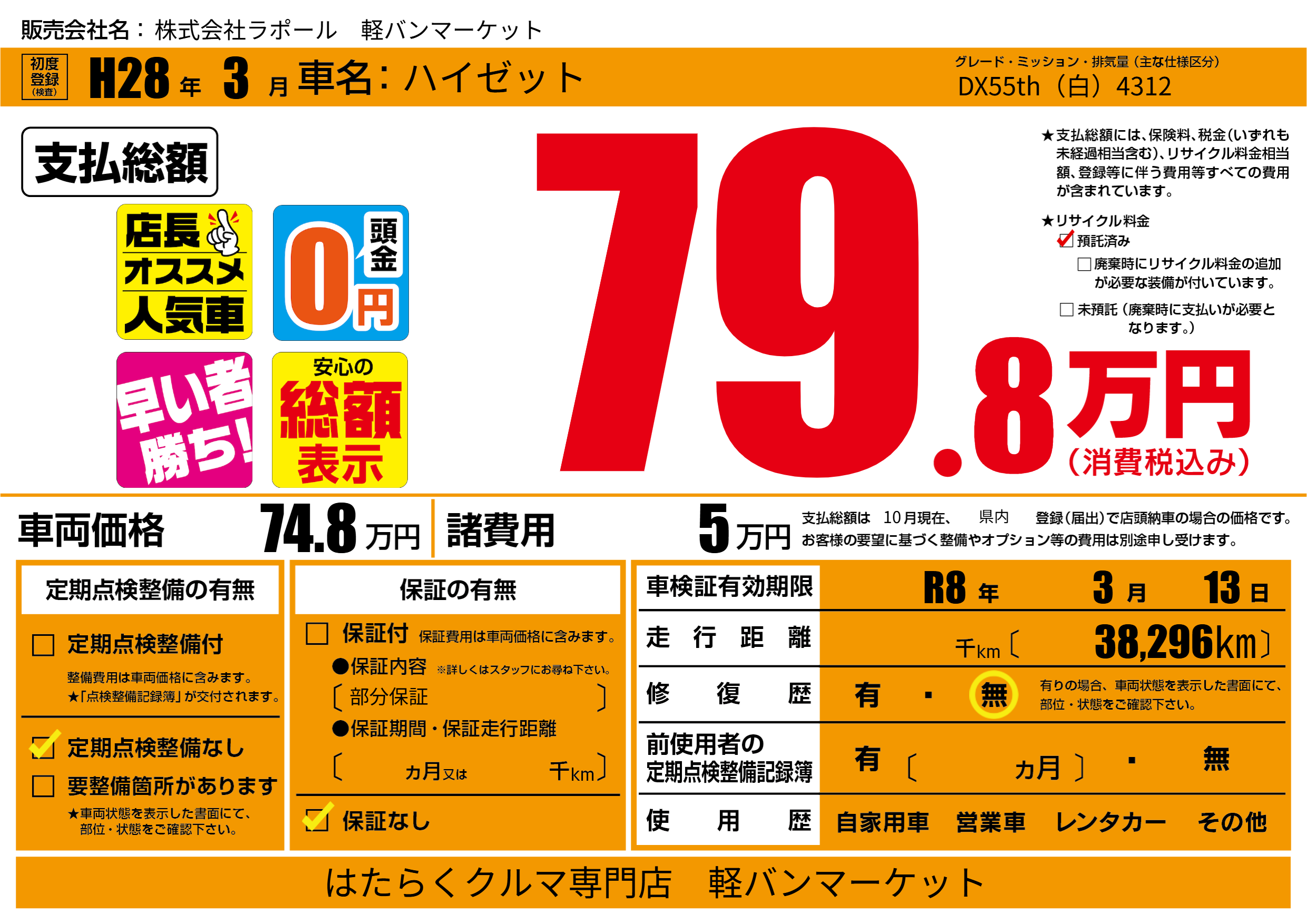 | 車検制限 | R8年 3月 13日 | ||