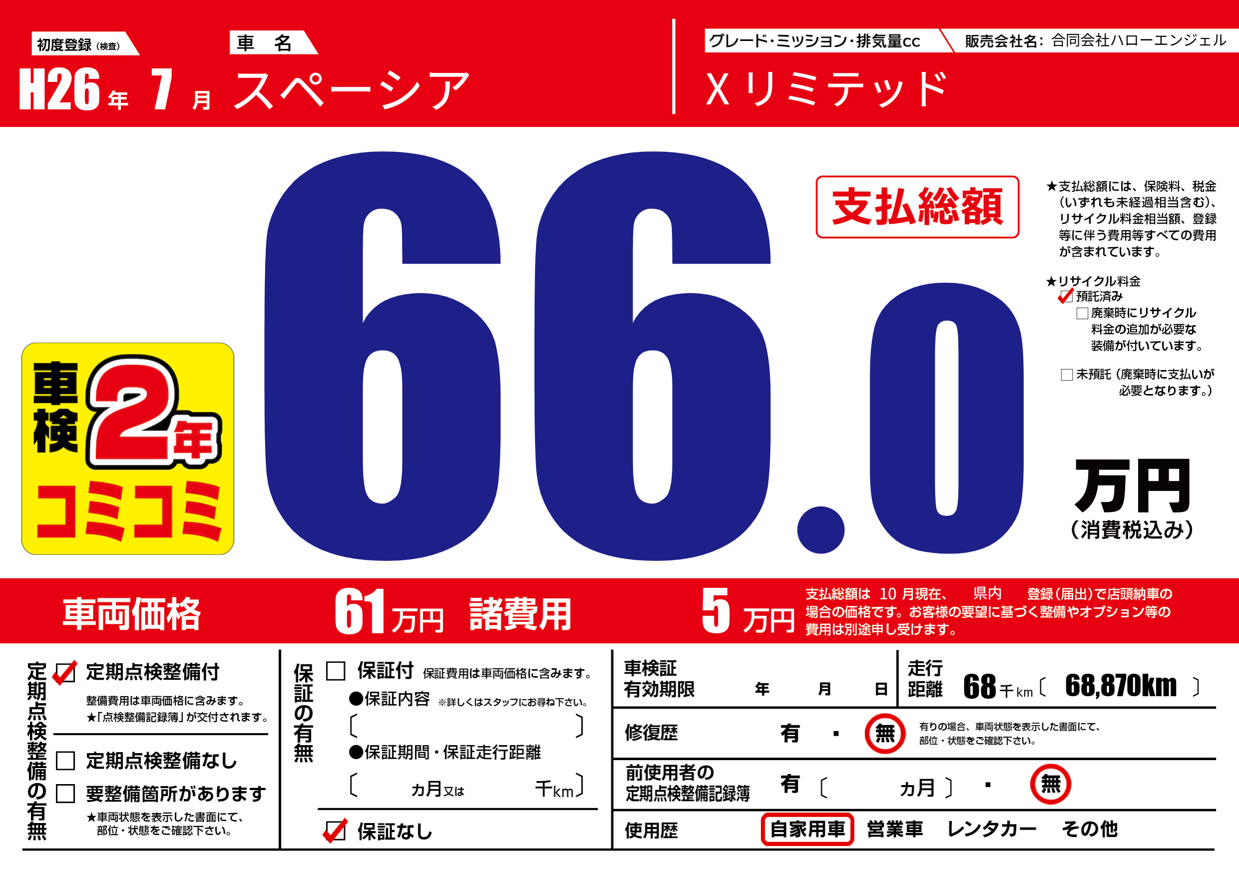 | 走行キロ | 6.8万km | 初年度登録 | H26年7月 |