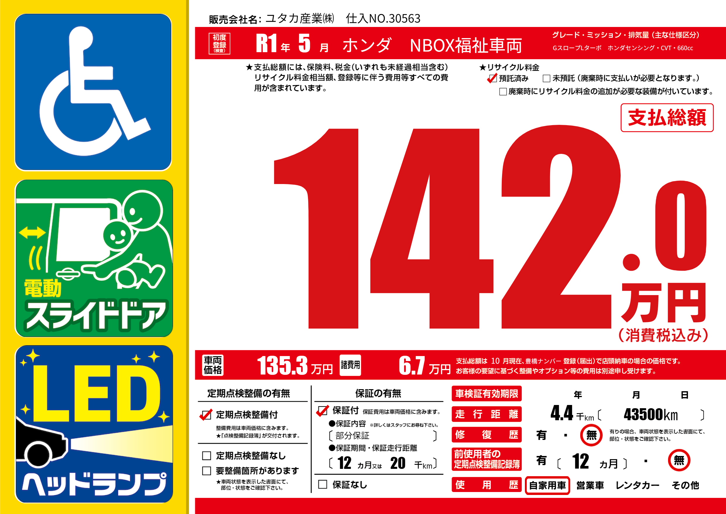 | 車名 | ホンダ NBOX福祉車両 | グレード ミッション 排気量 |