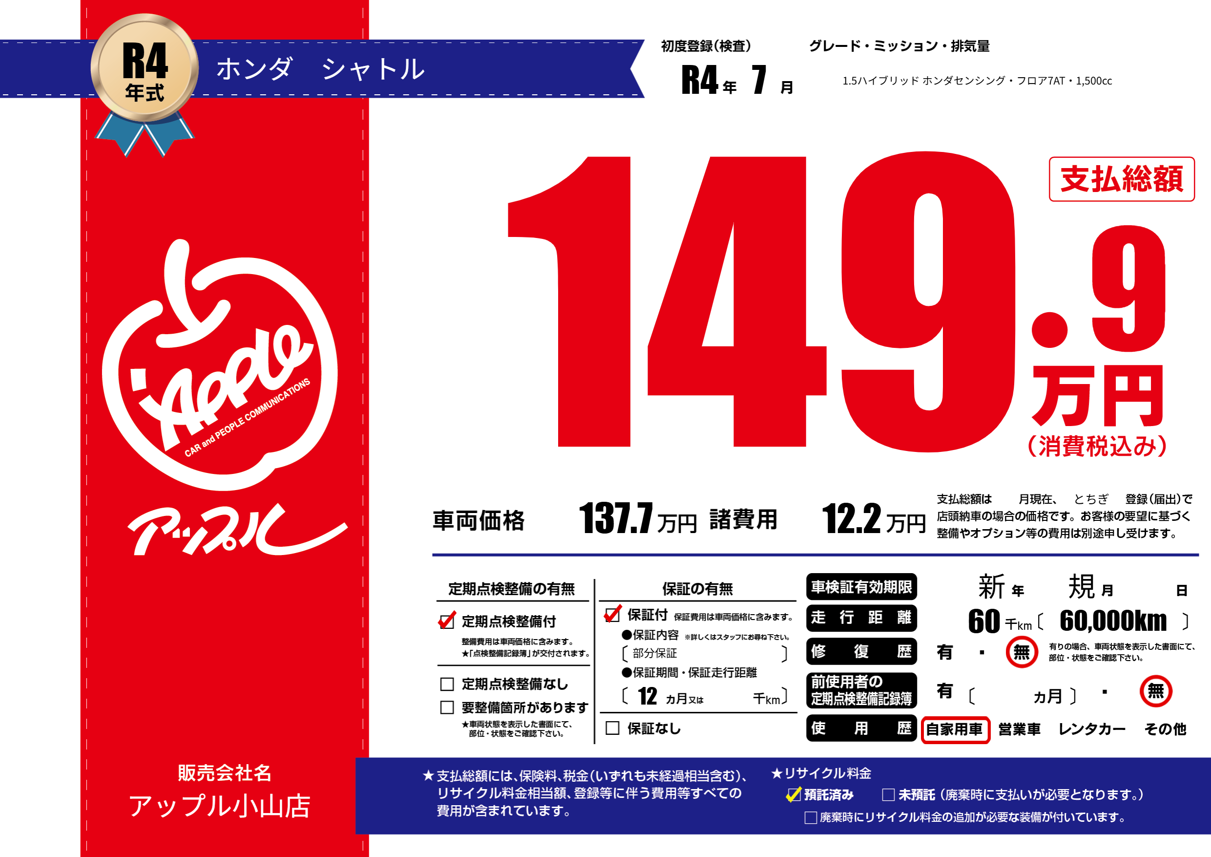 | 走行キロ | 6万km | 初年度登録 | R4年7月 |