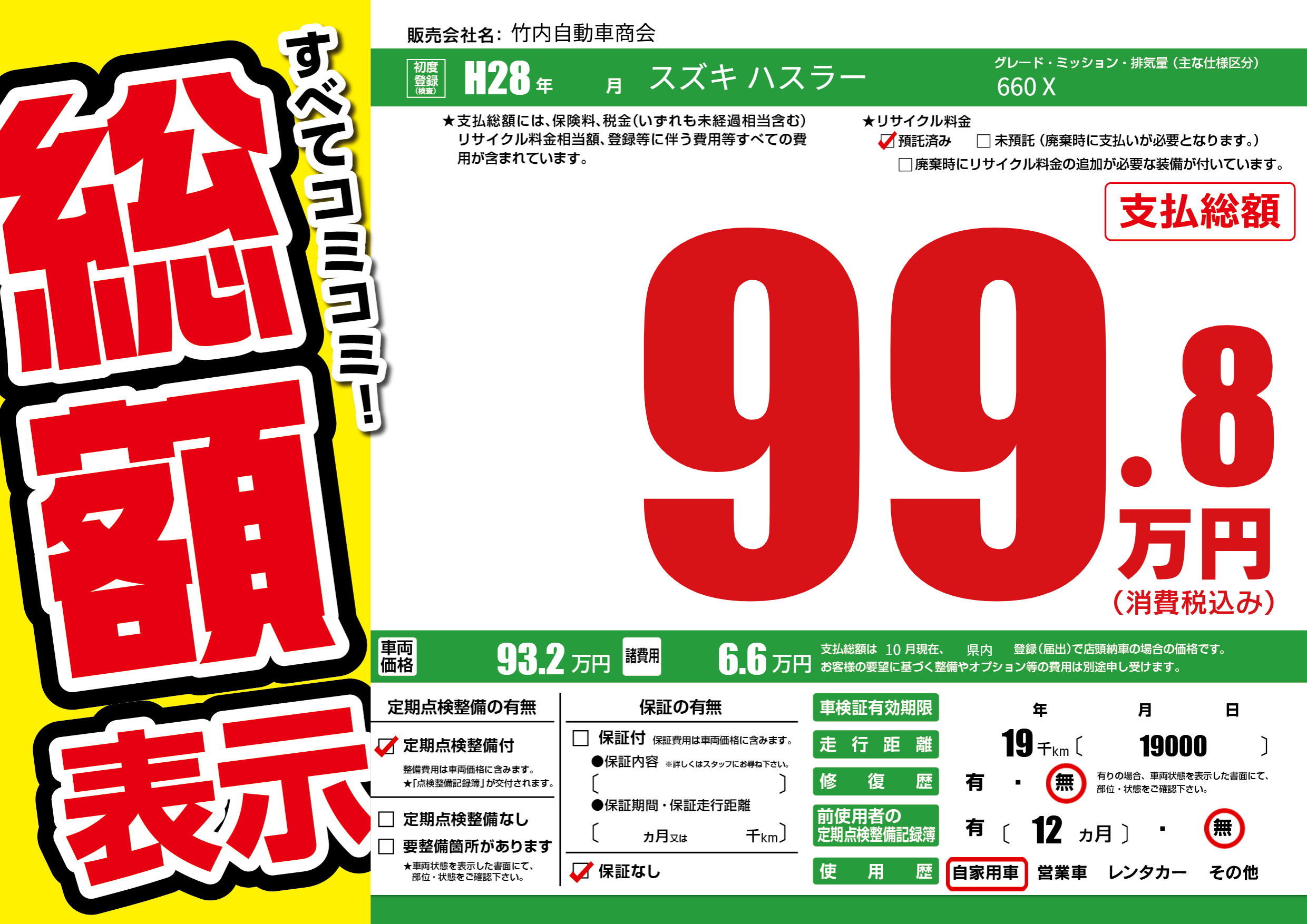 | 車名 | スズキ ハスラー | グレード ミッション 排気量 |