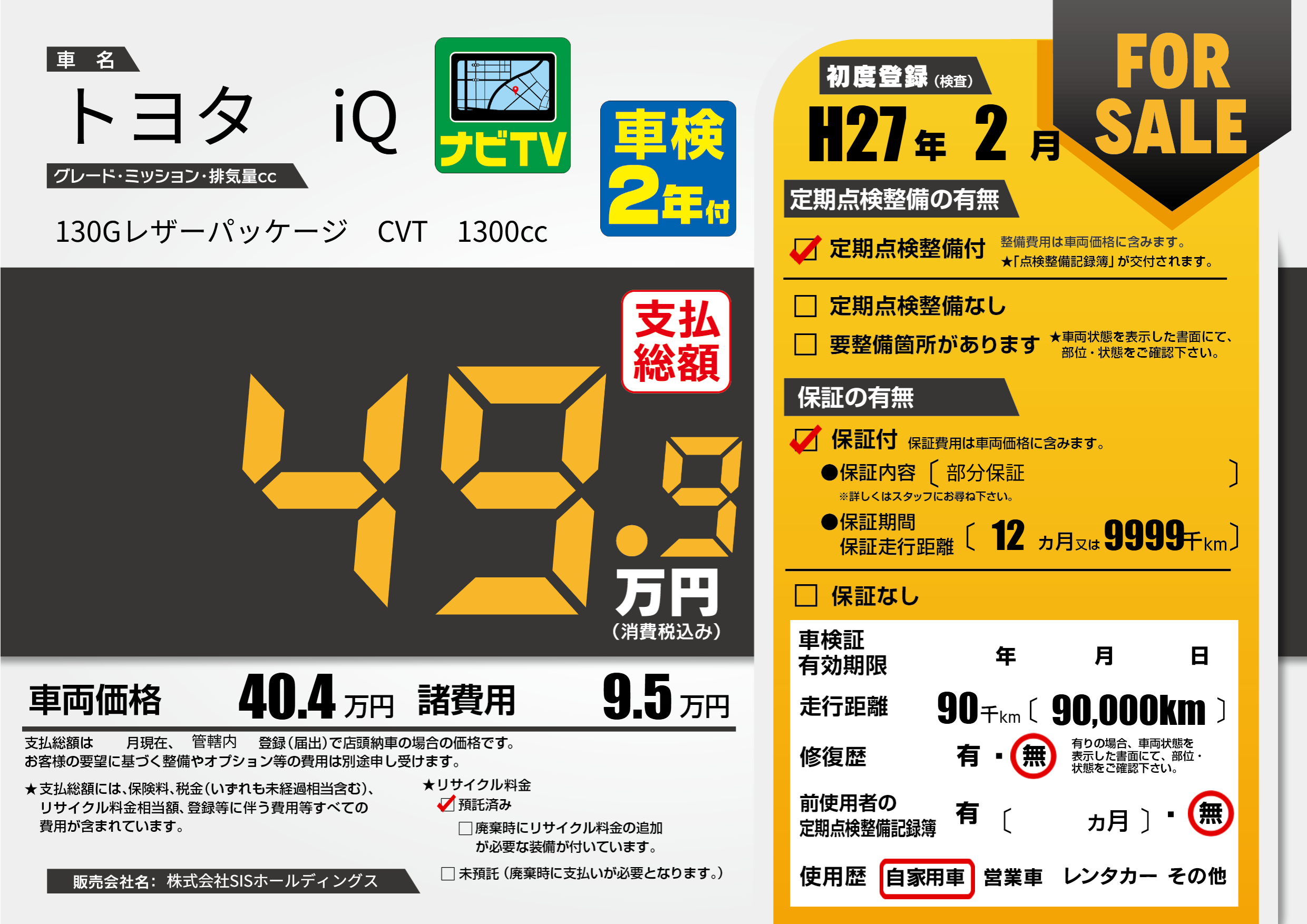 | 走行キロ | 9万km | 初年度登録 | H27年2月 |