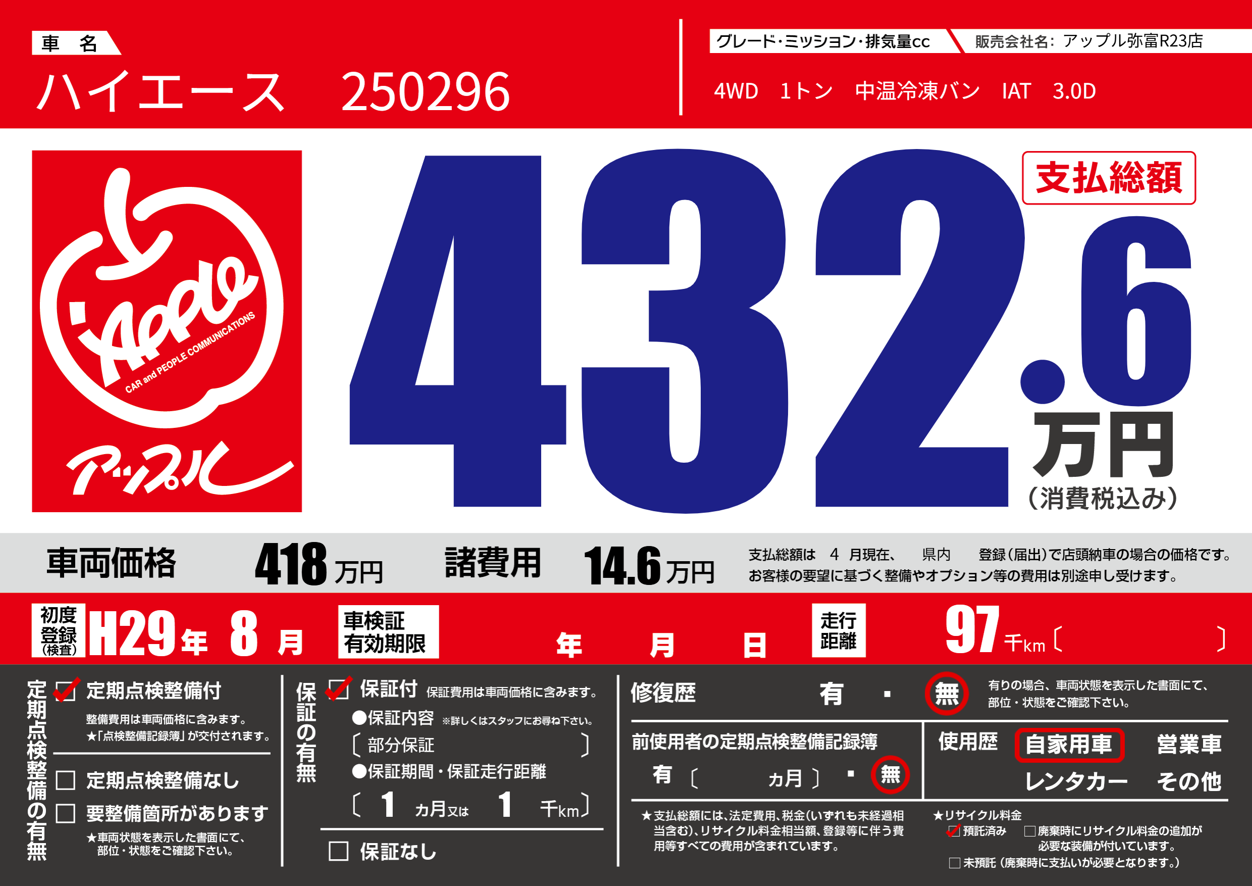 | 車名 | ハイエース 250296 | グレード ミッション 排気量 |