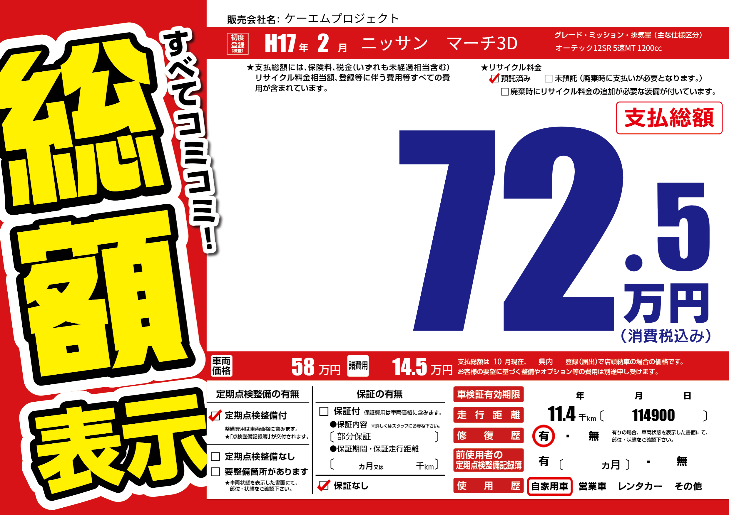 | 車名 | ニッサン マーチ3D | グレード ミッション 排気量 |