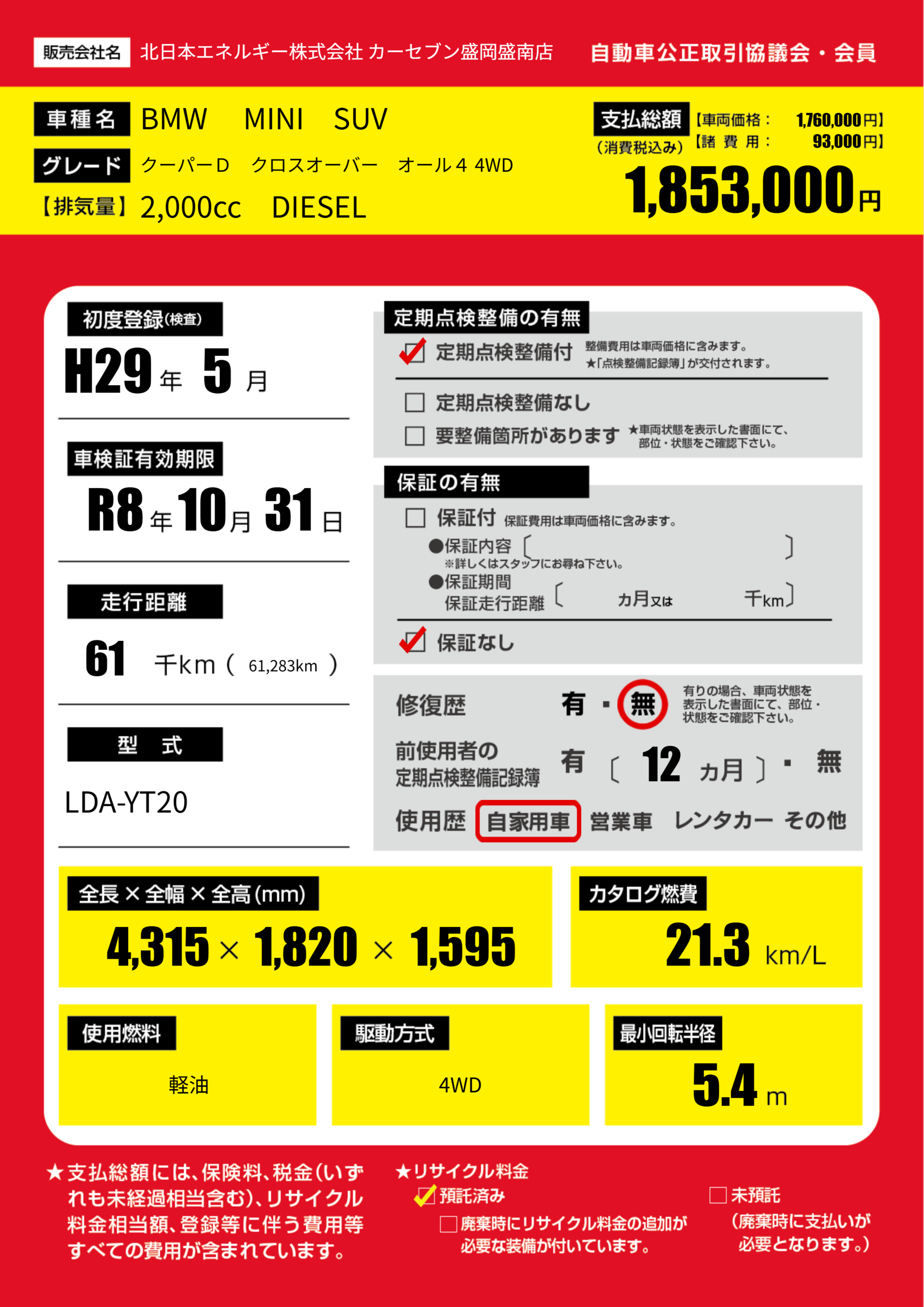 | 車名 | BMW MINI SUV | グレード ミッション 排気量 |