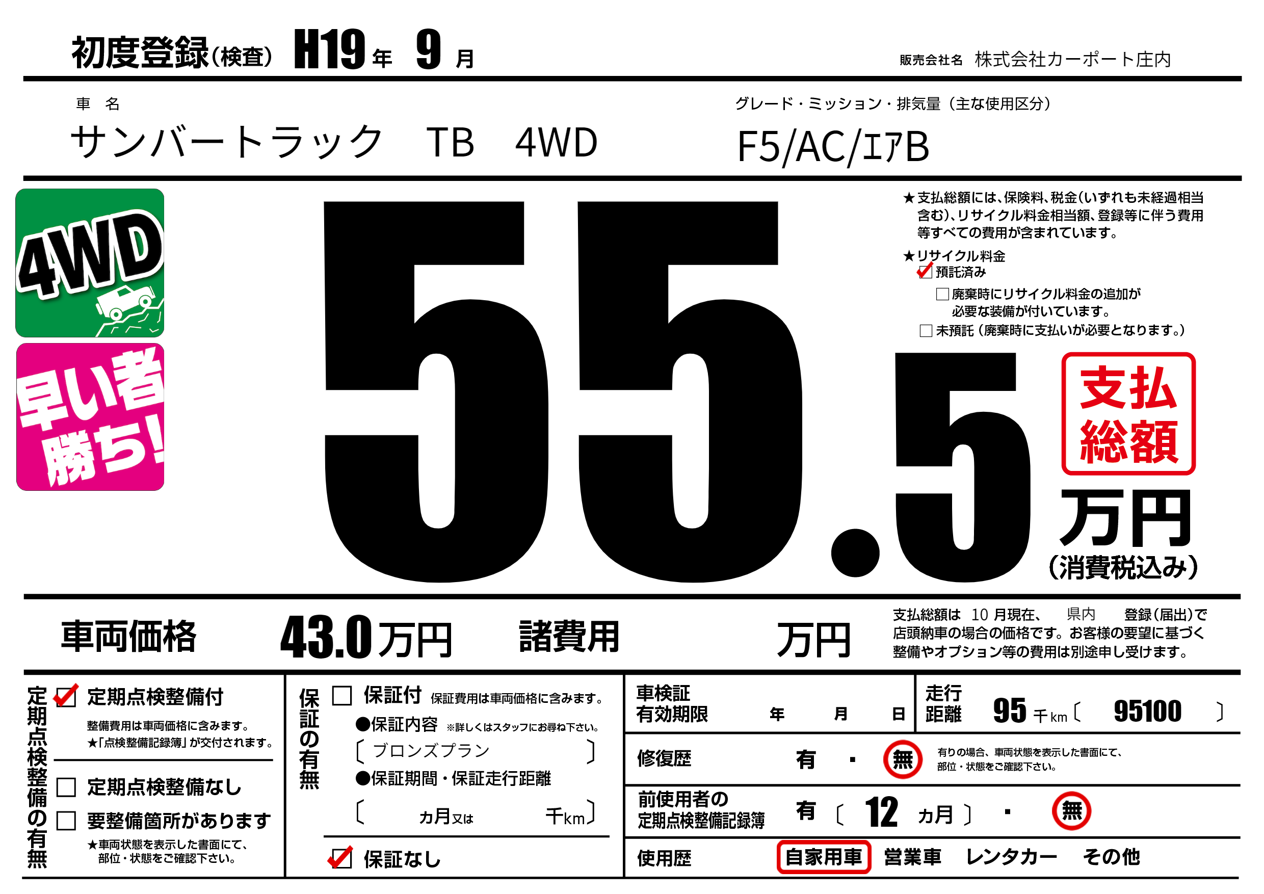 | 車名 | サンバートラック TB 4WD | グレード ミッション 排気量 |