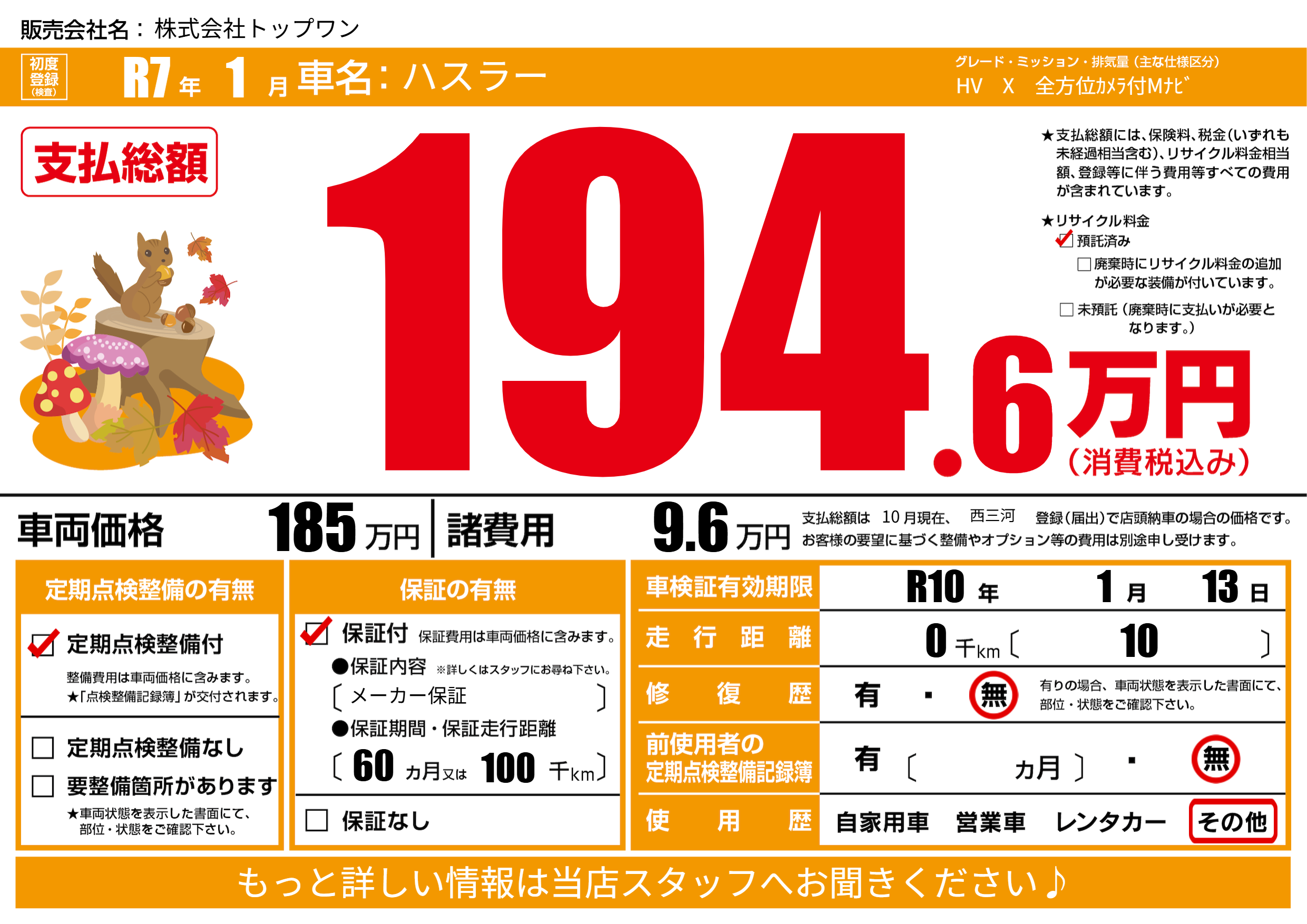 | 車検制限 | R10年 1月 13日 | ||