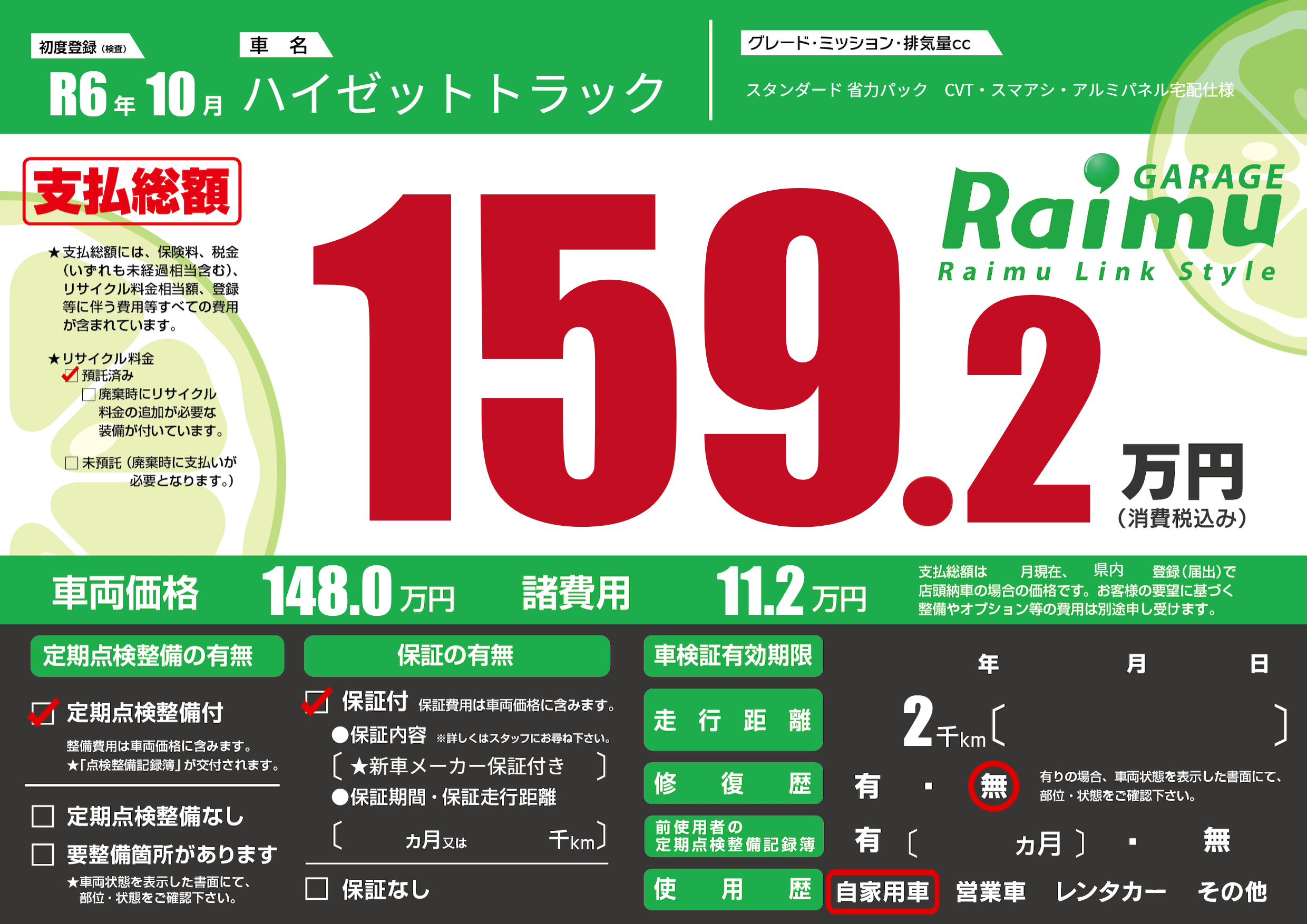 保証付き 保証内容(★新車メーカー保証付き) ---ヶ月または()千kmまで |
