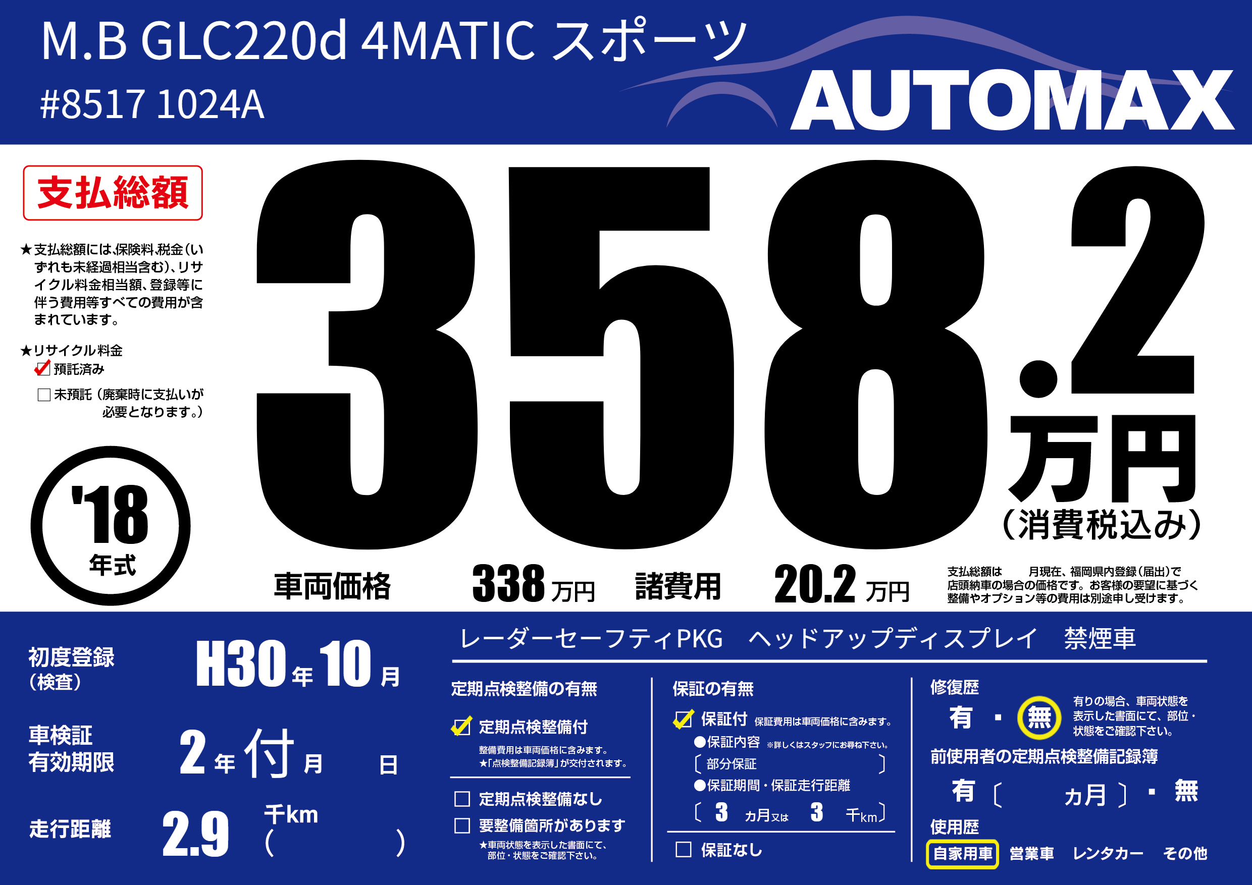 | 車名 | M.B GLC220d 4MATIC スポーツ | グレード ミッション 排気量 |