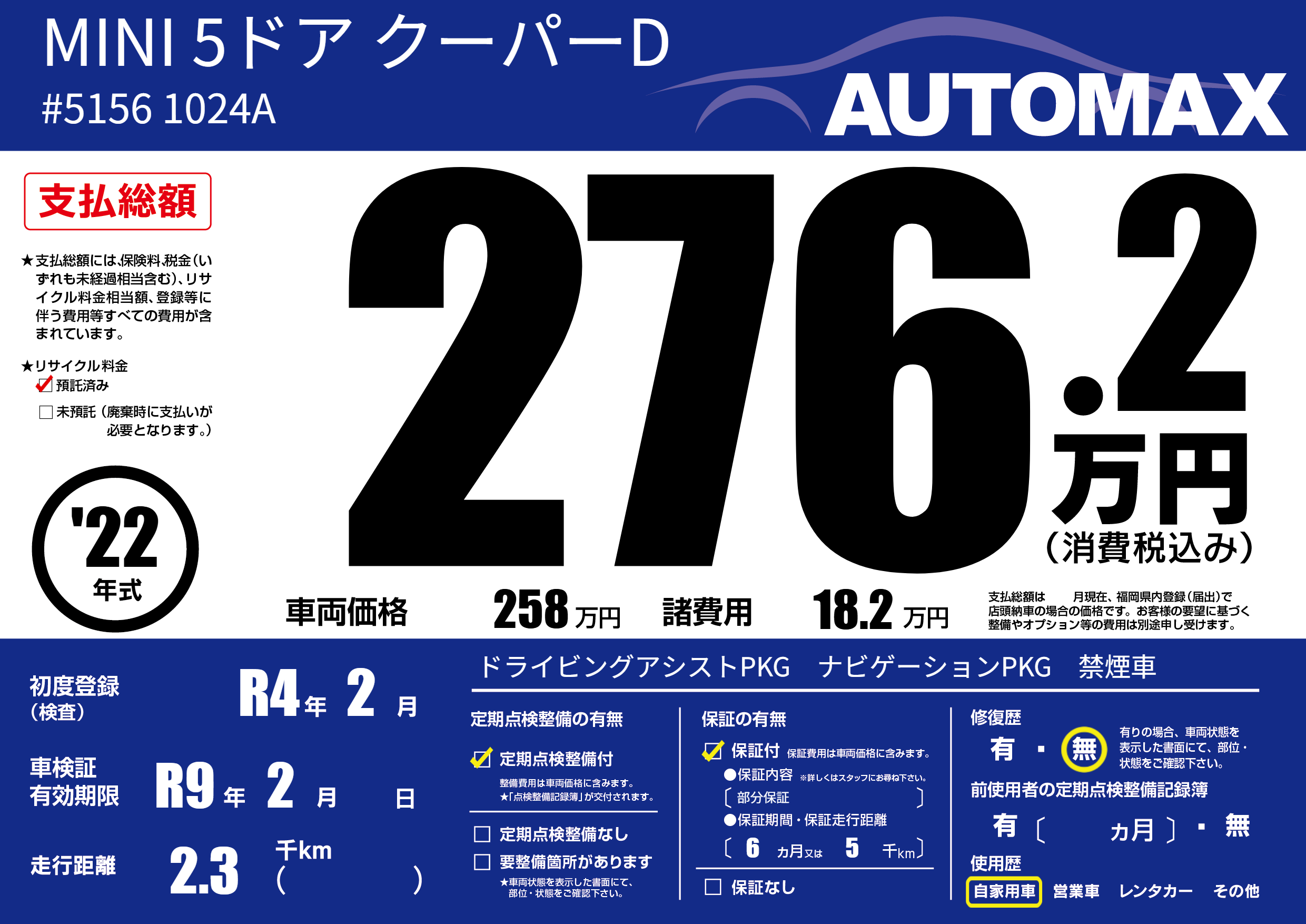 | 走行キロ | 0.2万km | 初年度登録 | R4年2月 |